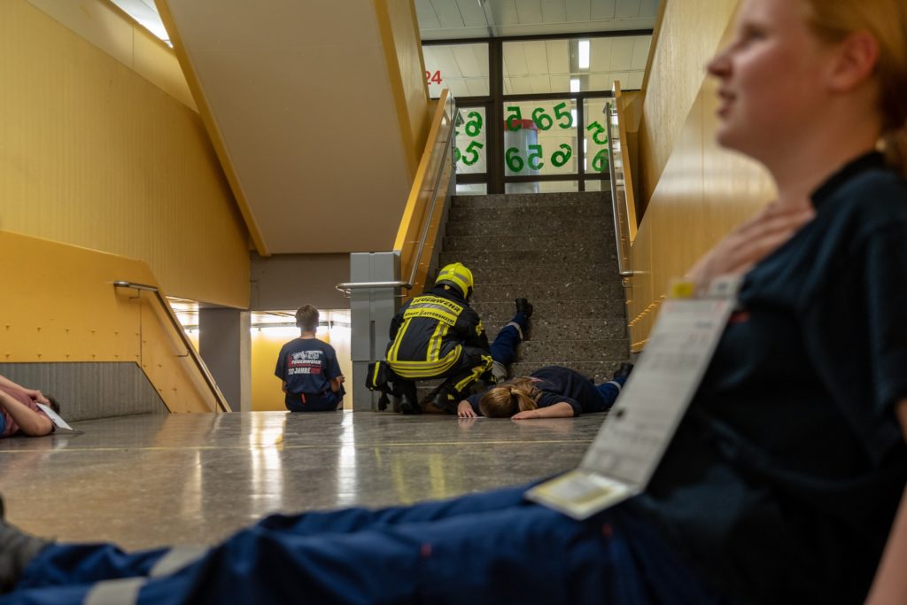 Den ersteintreffenden Einheiten von Feuerwehr und Rettungsdienst bot sich eine sehr unübersichtliche Lage. Es brannte im ersten Obergeschoss, fünf Kinder standen im zweiten Obergeschoss an Fenstern und weitere 18 Verletzte lagen und saßen im gesamten Schulgebäude verteilt.