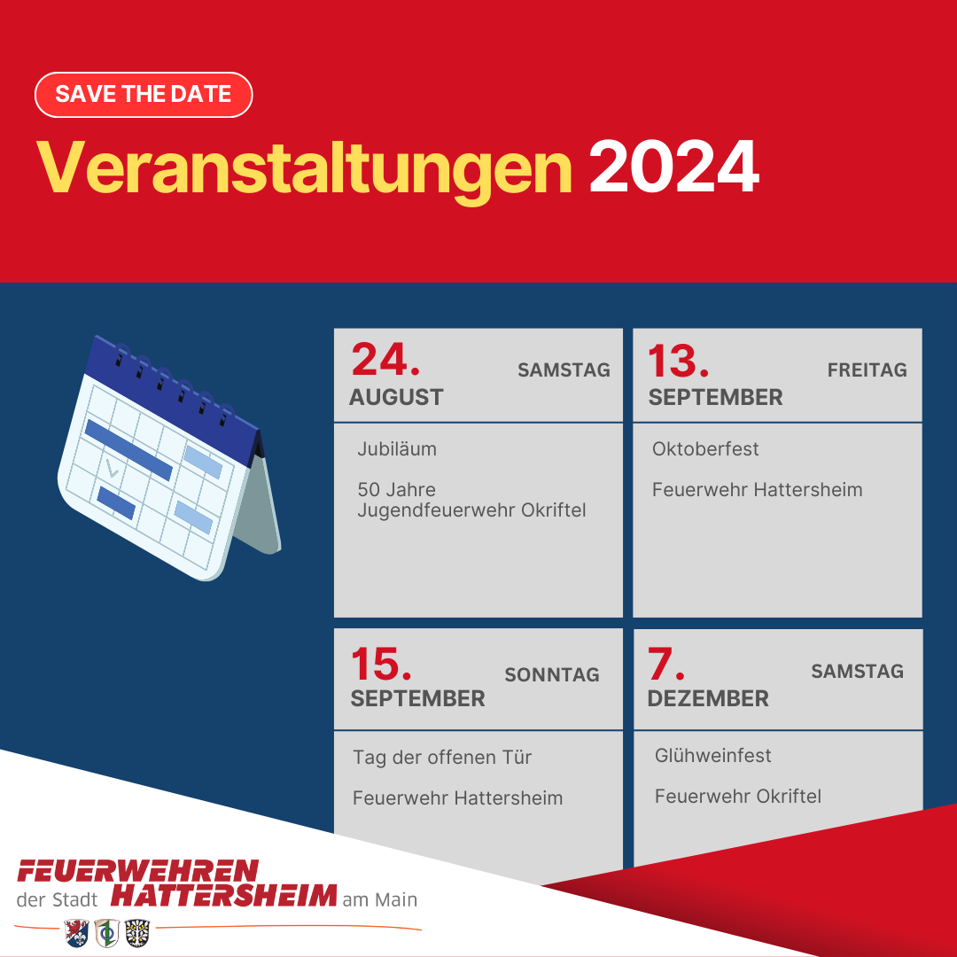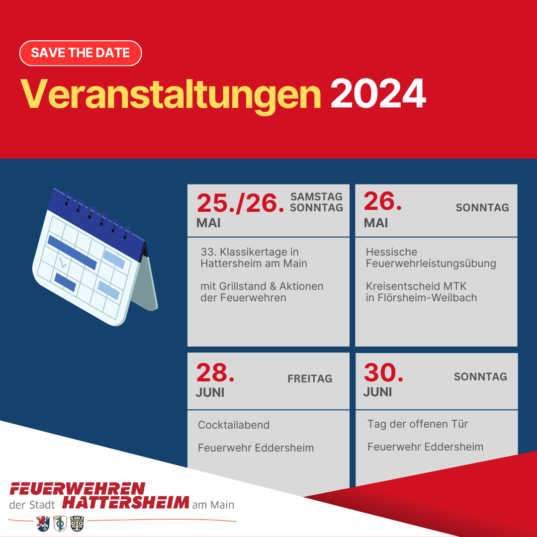 Die Feuerwehren der Stadt Hattersheim am Main laden auch in diesem Jahr wieder zu einer Reihe von spannenden und unterhaltsamen Veranstaltungen ein. Von Klassikertagen mit Grillstand bis hin zur Feuerwehrleistungsübung und einer Jubiläumsfeier ist für jeden etwas dabei.