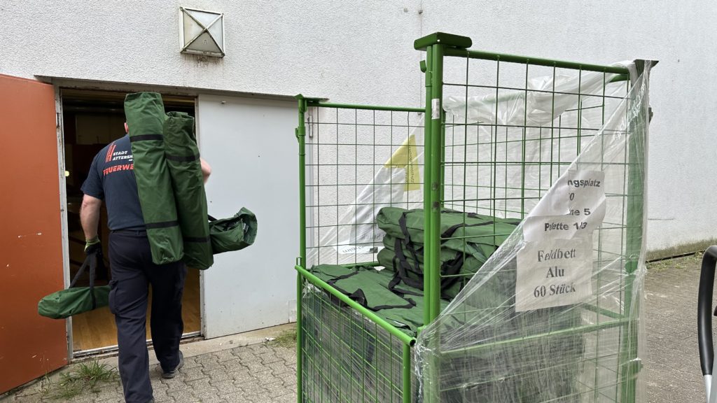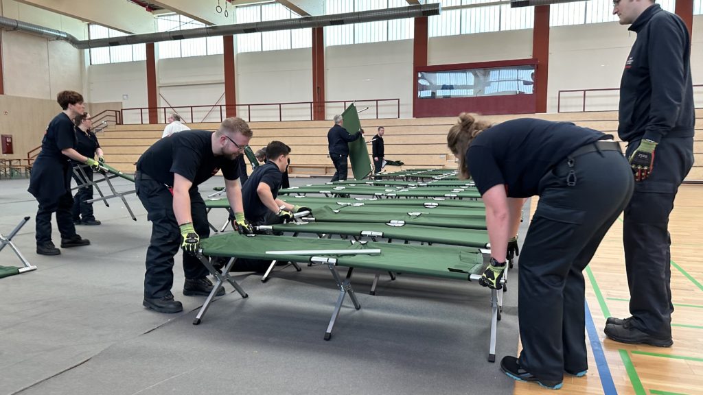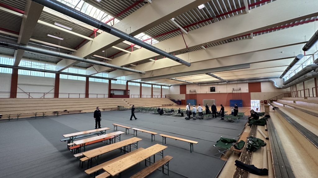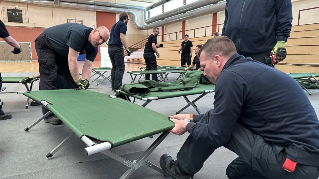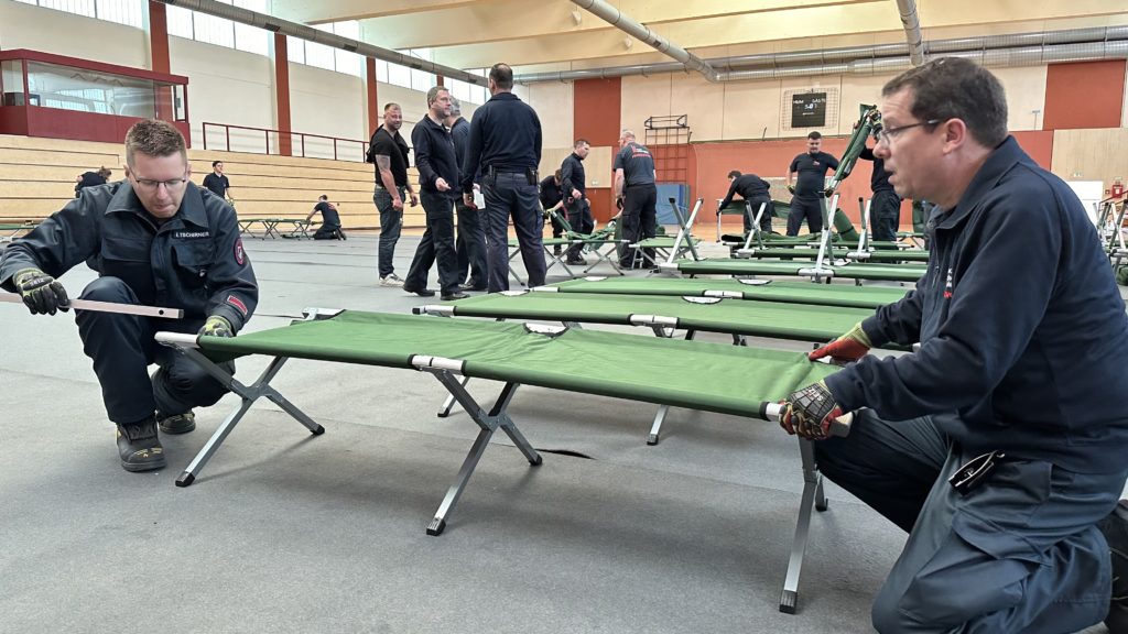 Zum Schutz des Hallenbodens wurden zunächst Teppiche ausgelegt. Anschließend wurden die bei Feuerwehr und DRK sowie im Katastrophenschutzlager des MTK vorgehaltenen Feldbetten und Biertischgarnituren aufgebaut.