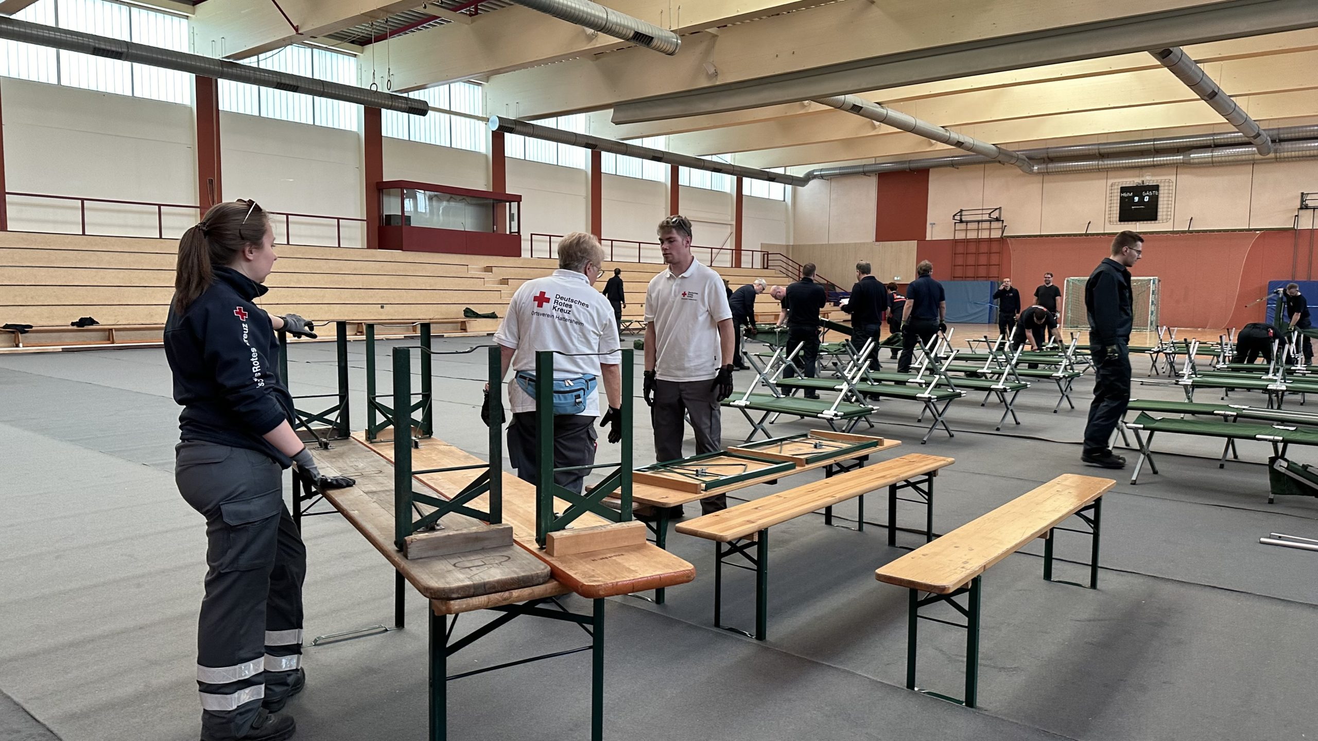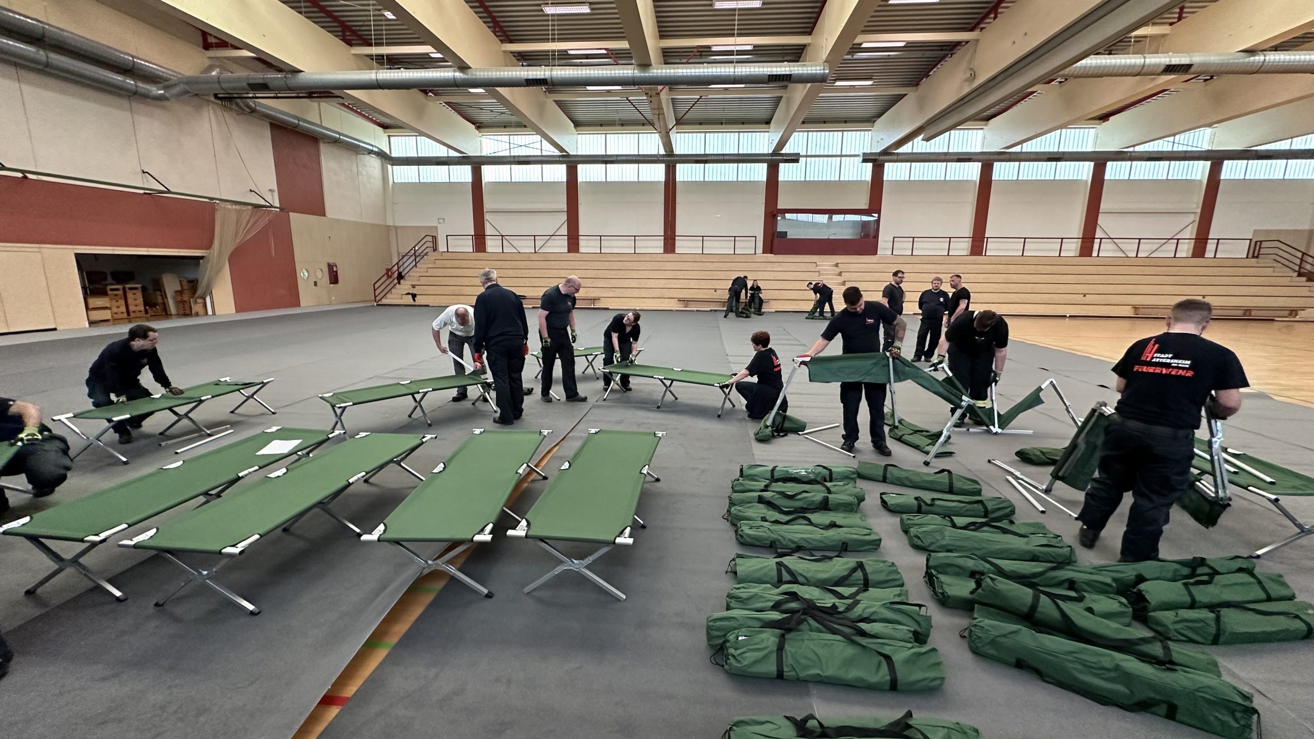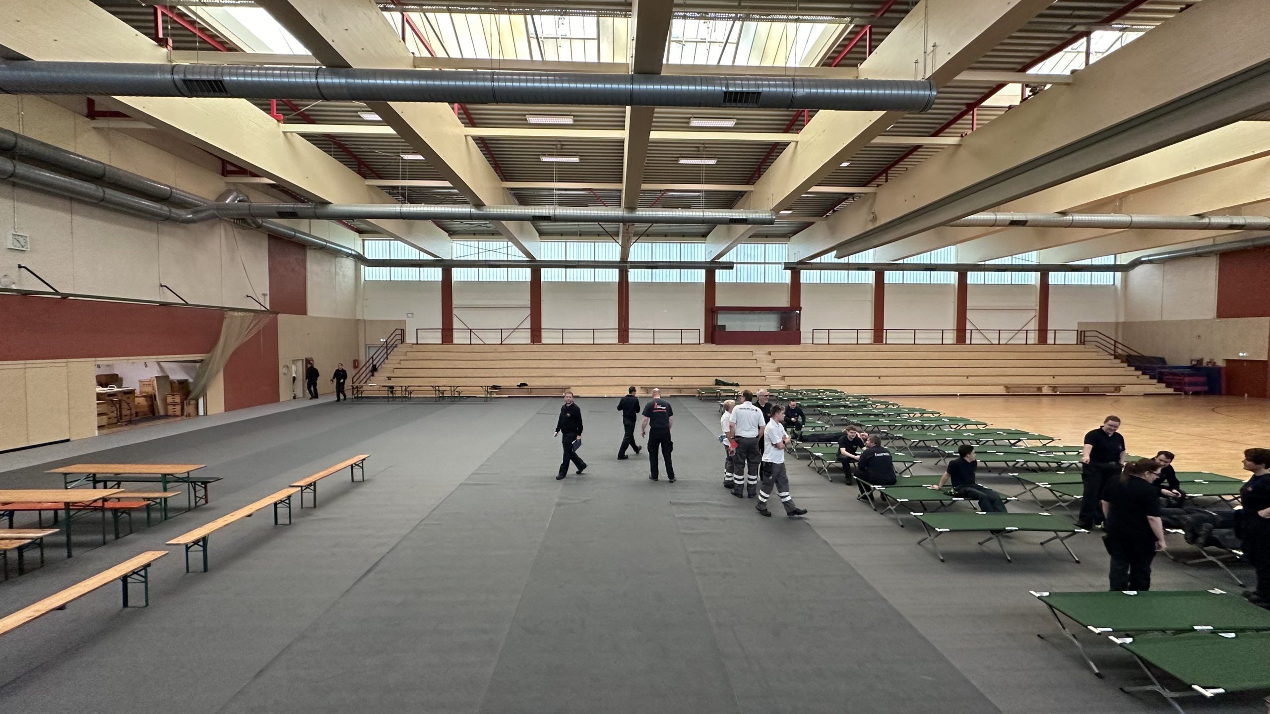 Zum Schutz des Hallenbodens wurden zunächst Teppiche ausgelegt. Anschließend wurden die bei Feuerwehr und DRK sowie im Katastrophenschutzlager des MTK vorgehaltenen Feldbetten und Biertischgarnituren aufgebaut.