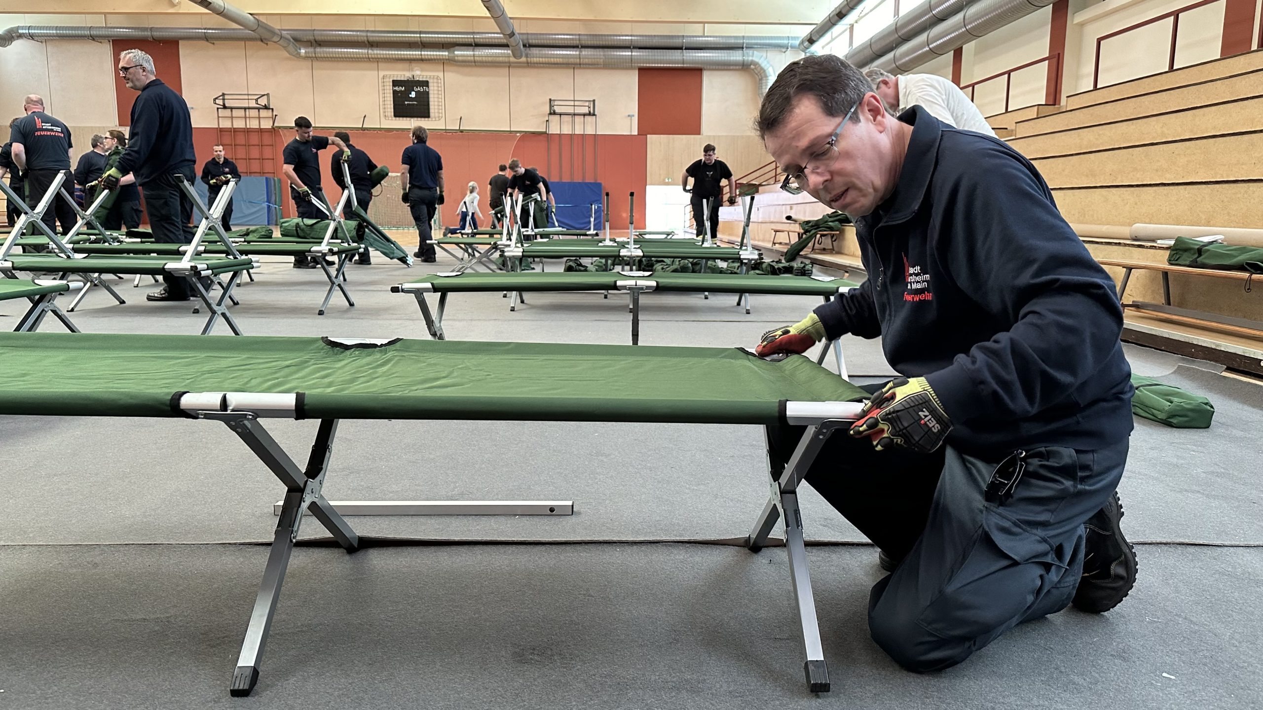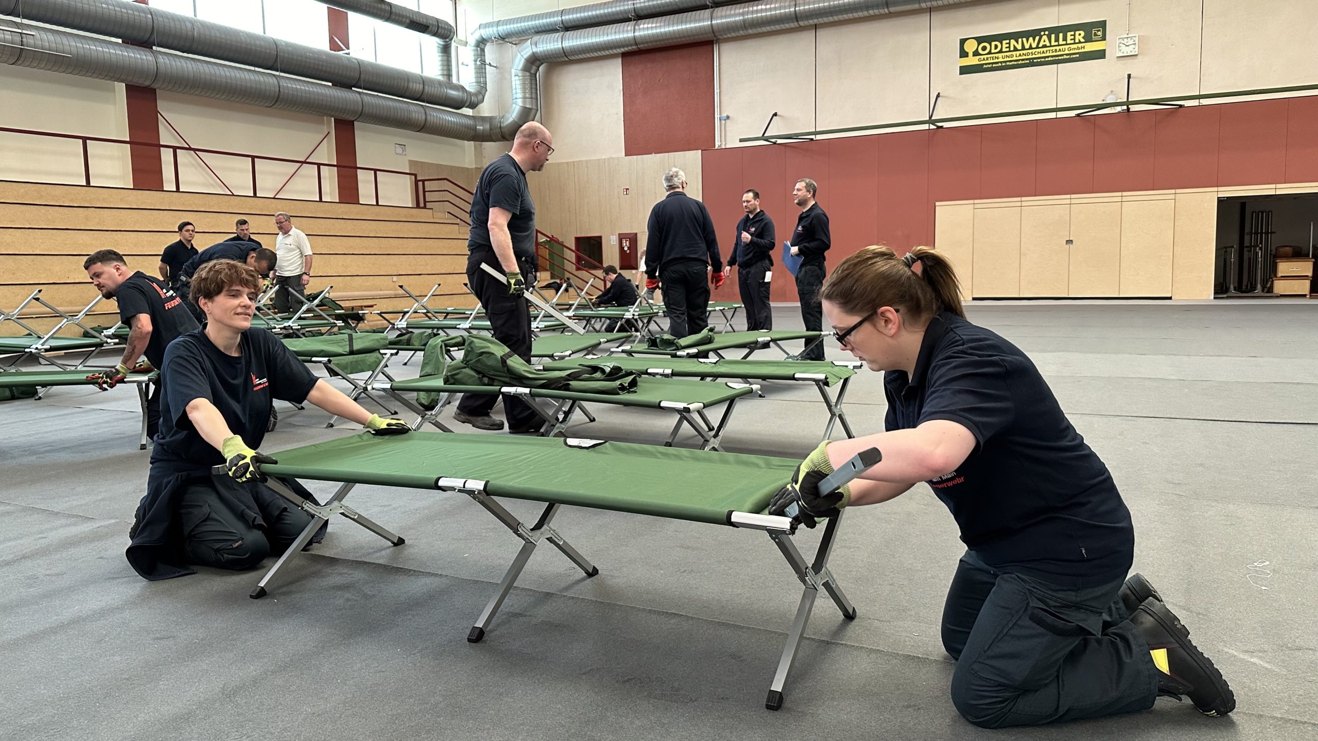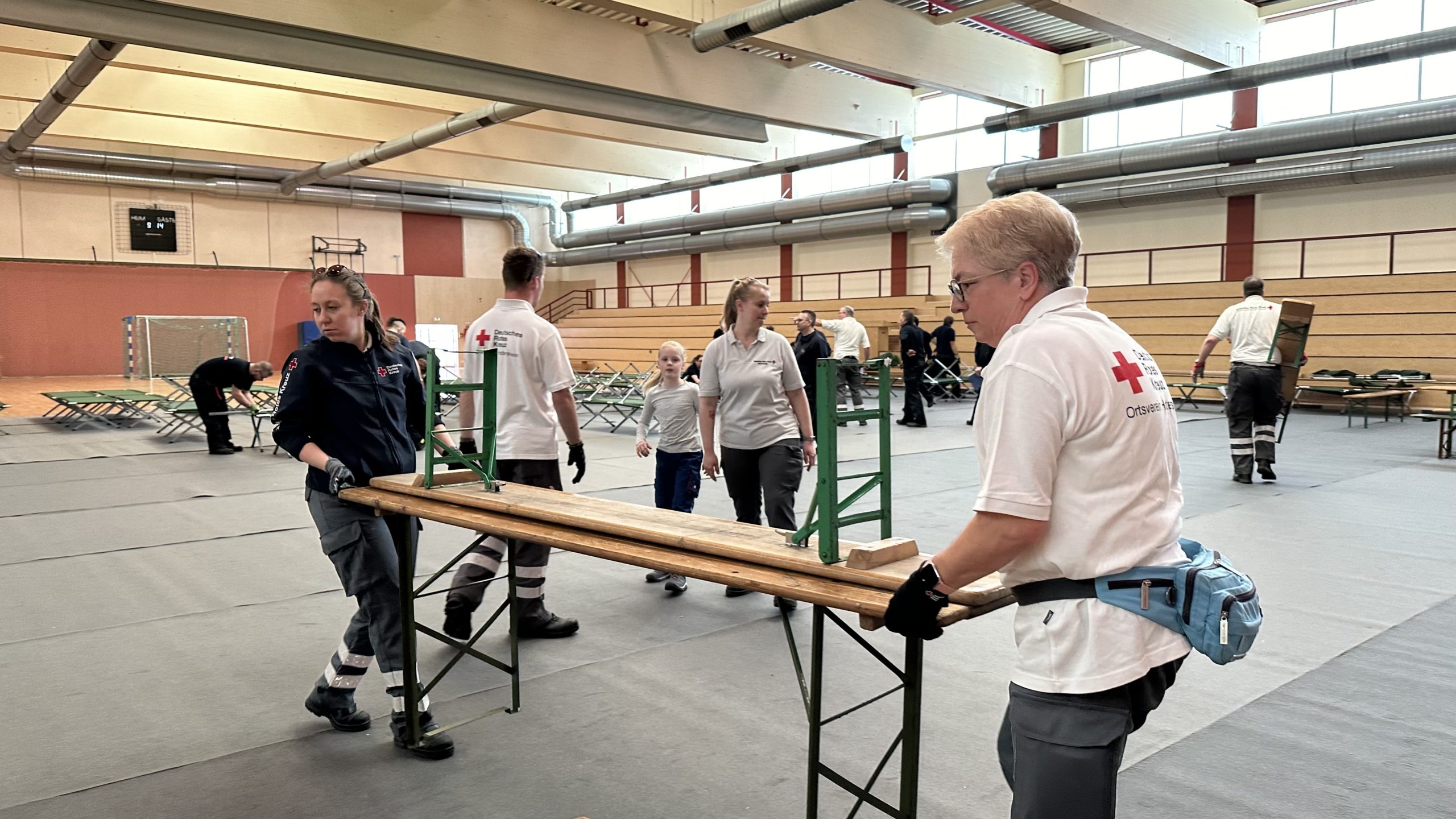 Zum Schutz des Hallenbodens wurden zunächst Teppiche ausgelegt. Anschließend wurden die bei Feuerwehr und DRK sowie im Katastrophenschutzlager des MTK vorgehaltenen Feldbetten und Biertischgarnituren aufgebaut.