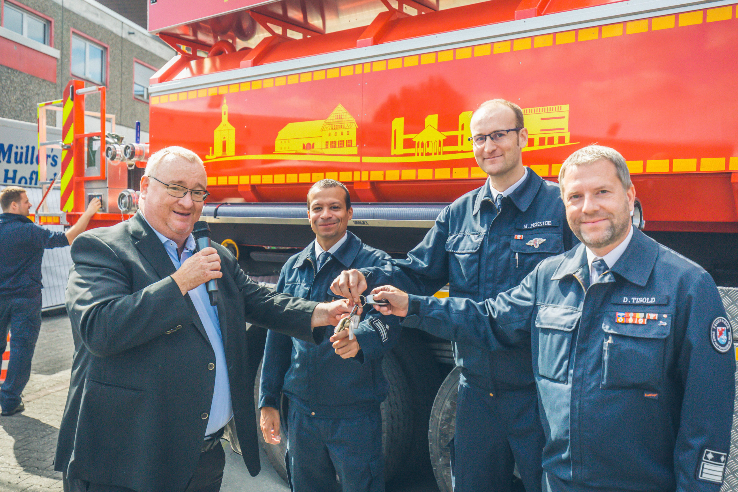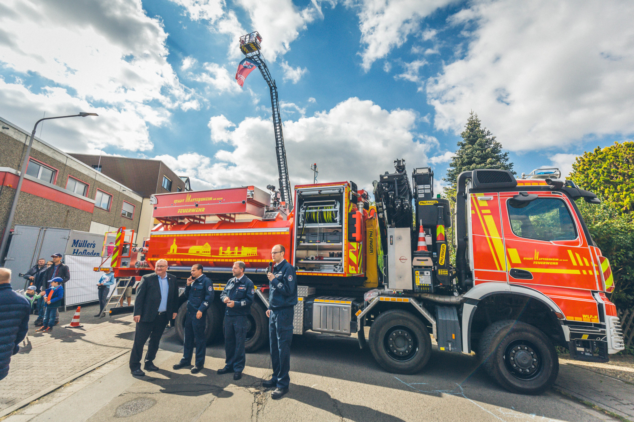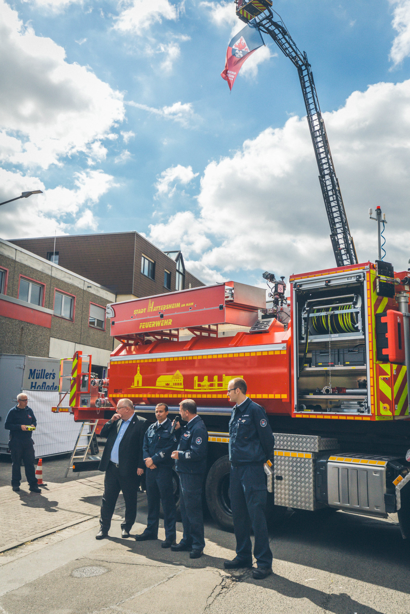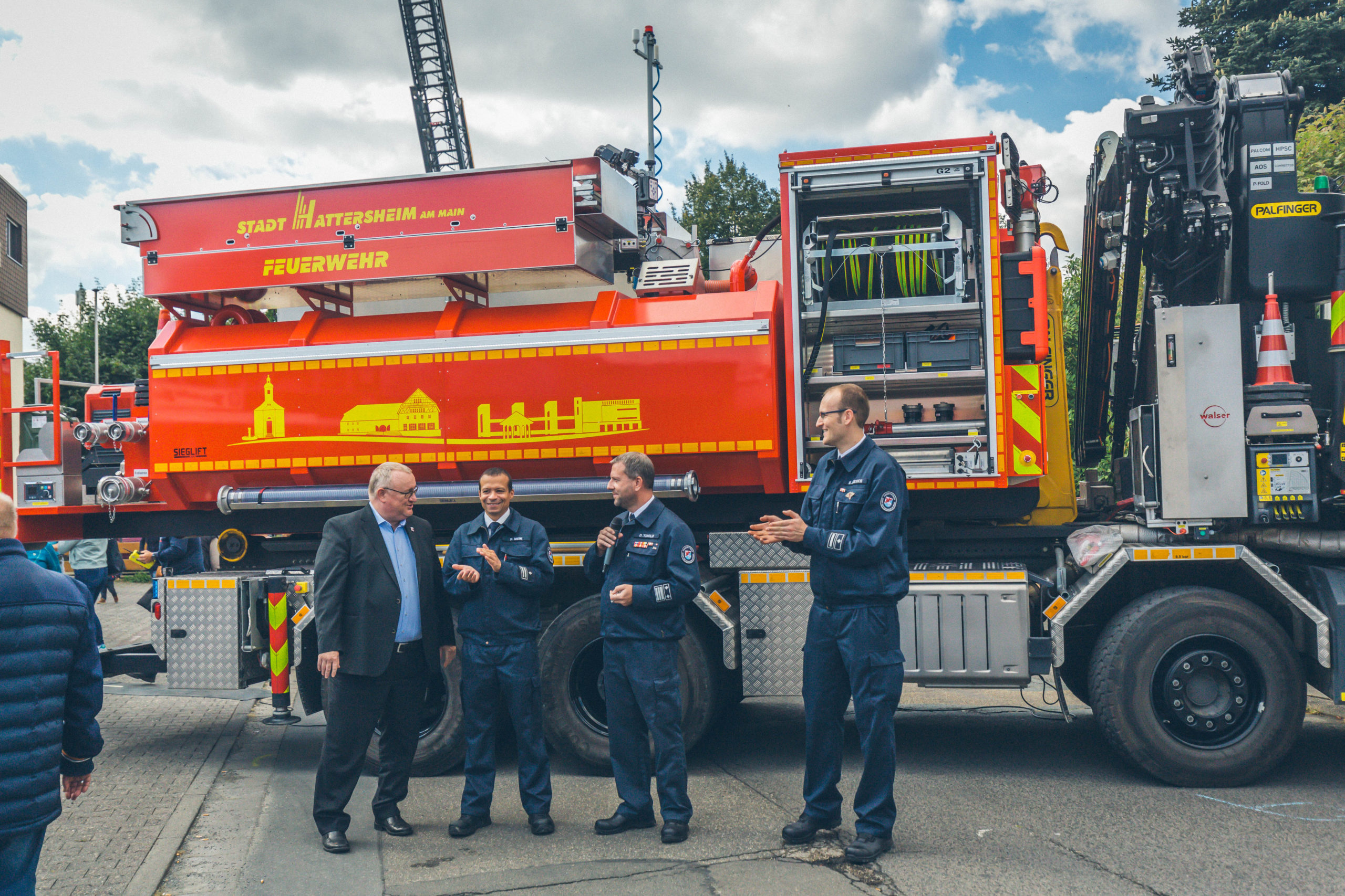 Im Rahmen des Tages der offenen Tür der Freiwilligen Feuerwehr Hattersheim am Main fand am vergangenen Sonntag die offizielle Übergabe des neuen Abrollbehälters Wasser (AB-Wasser) durch Bürgermeister Klaus Schindling und Stadtbrandinspektor David Tisold statt. Die Hattersheimer Wehrführer Manuel Peknice und Patrick Meik nahmen das hochmoderne Einsatzgerät entgegen, das die Einsatzbereitschaft der Feuerwehr weiter verbessern wird.