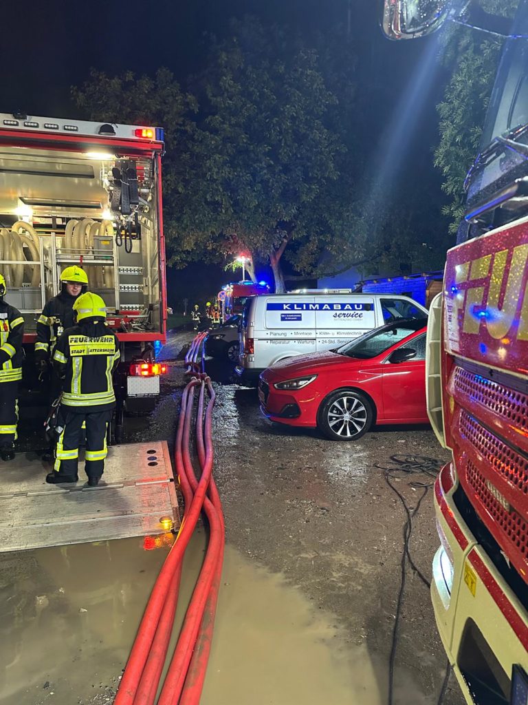Rund 60 ehrenamtliche Einsatzkräfte waren trotz des strömenden Regens bis nach Mitternacht im Einsatz. Der DRK OV Hattersheim versorgte die Feuerwehrkräfte mit Essen und Getränken.