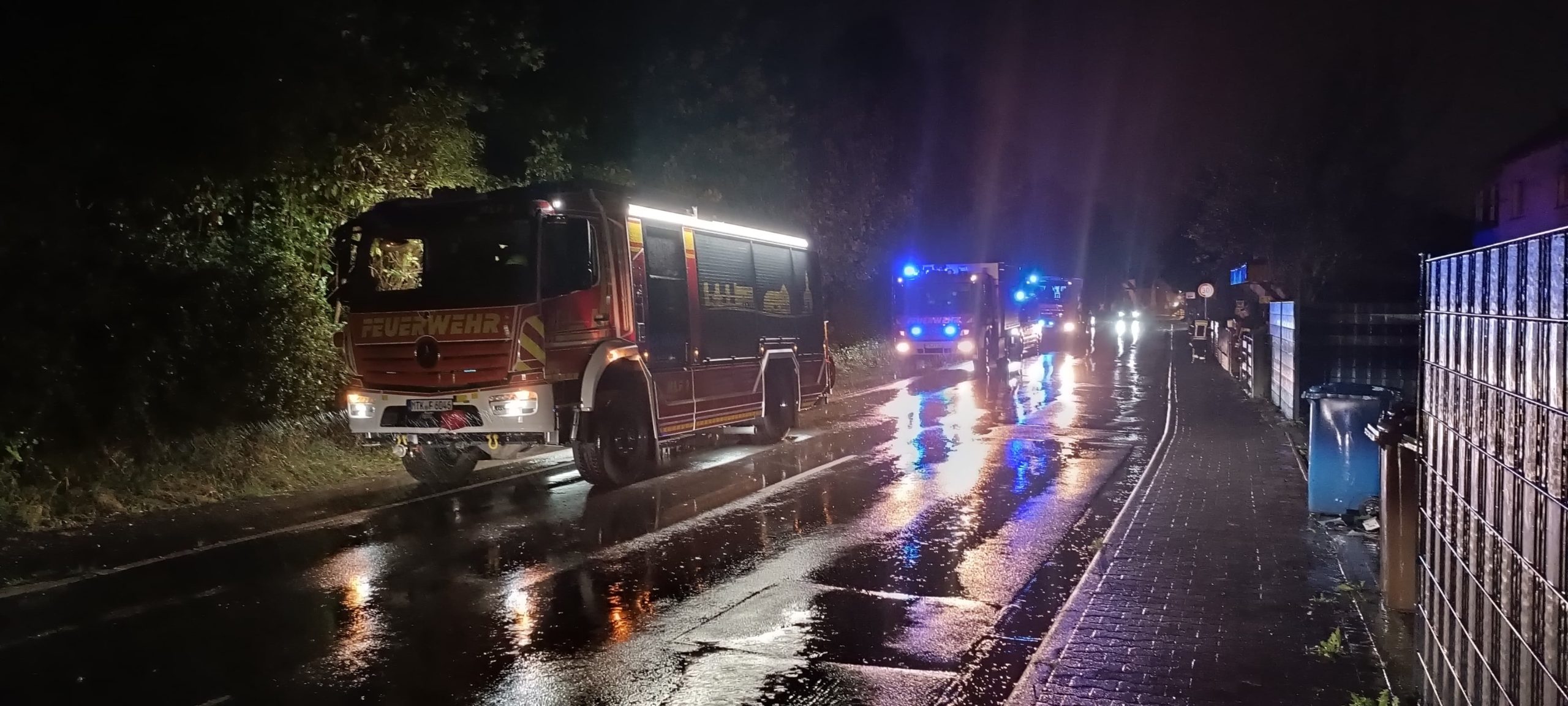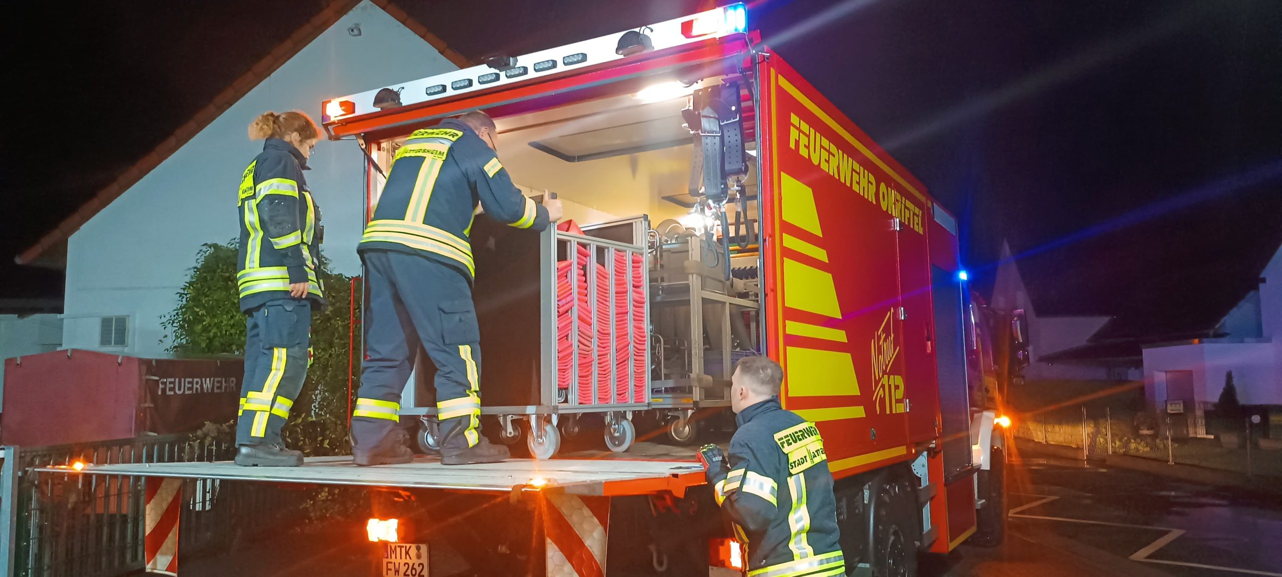 Rund 60 ehrenamtliche Einsatzkräfte waren trotz des strömenden Regens bis nach Mitternacht im Einsatz. Der DRK OV Hattersheim versorgte die Feuerwehrkräfte mit Essen und Getränken.