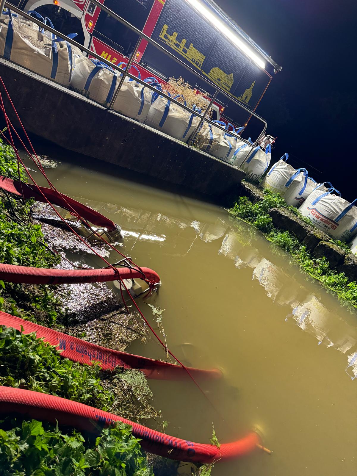 Mit 550 Sandsäcken und großen Sandsackbehältern, sogenannten Bigpacks, sicherten die Feuerwehrkräfte aus Hattersheim, Okriftel und Eddersheim den Deich auf rund 35 Metern. Mit mehreren Hochleistungspumpen wurde zusätzlich Wasser aus dem vollgelaufenen Graben abgepumpt. Drei Wohnhäuser in der unmittelbaren Nähe konnten so erfolgreich geschützt werden.