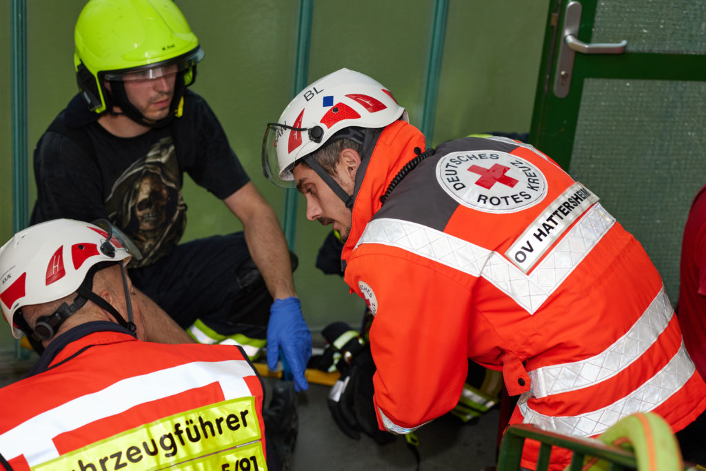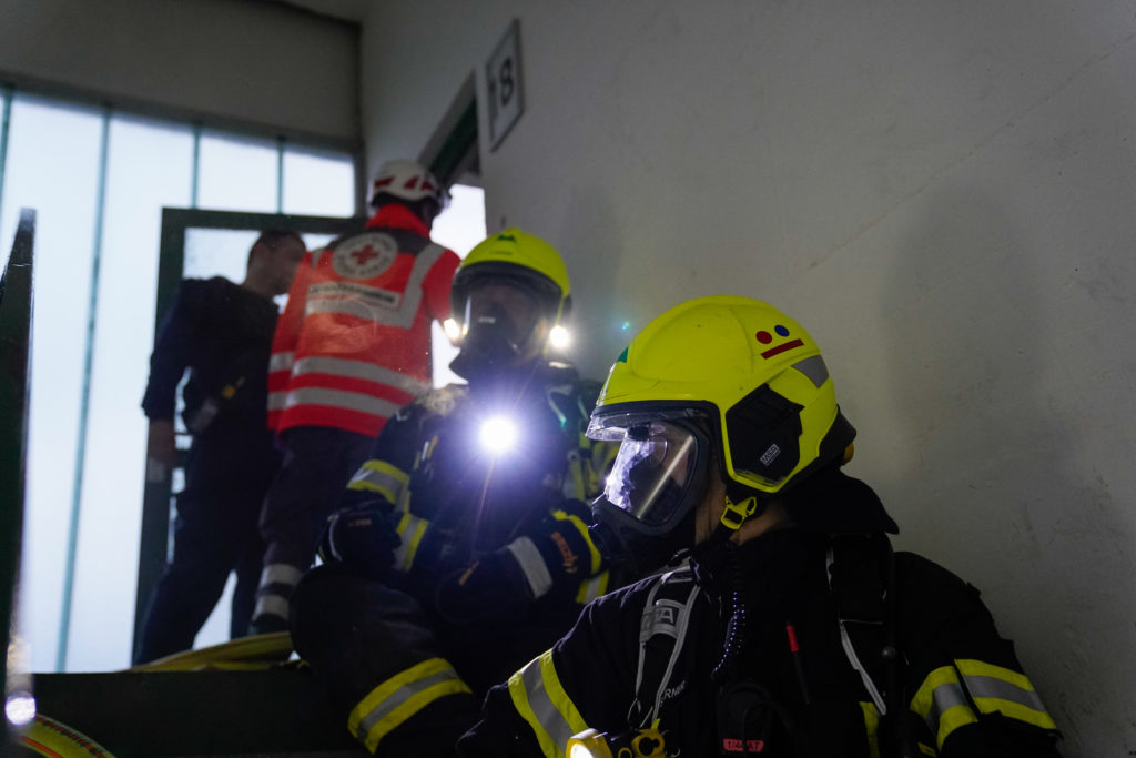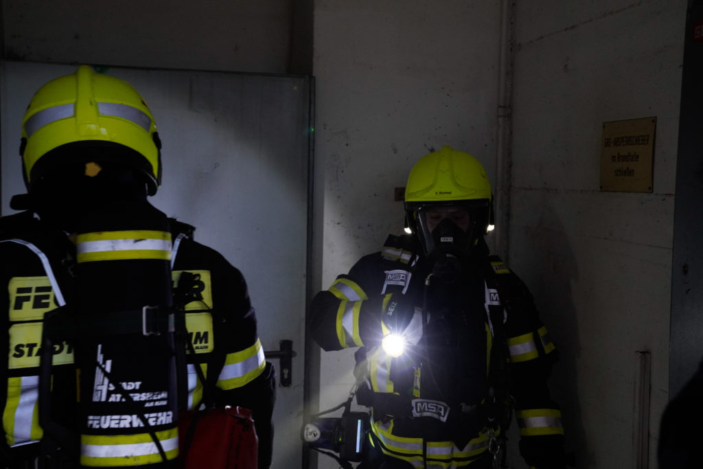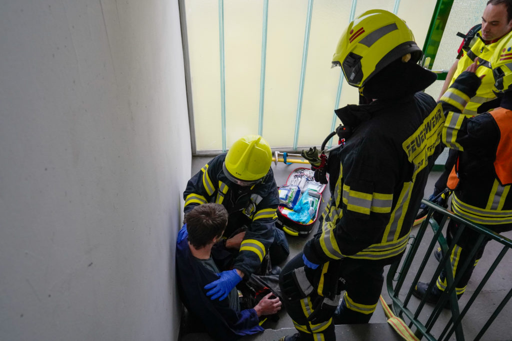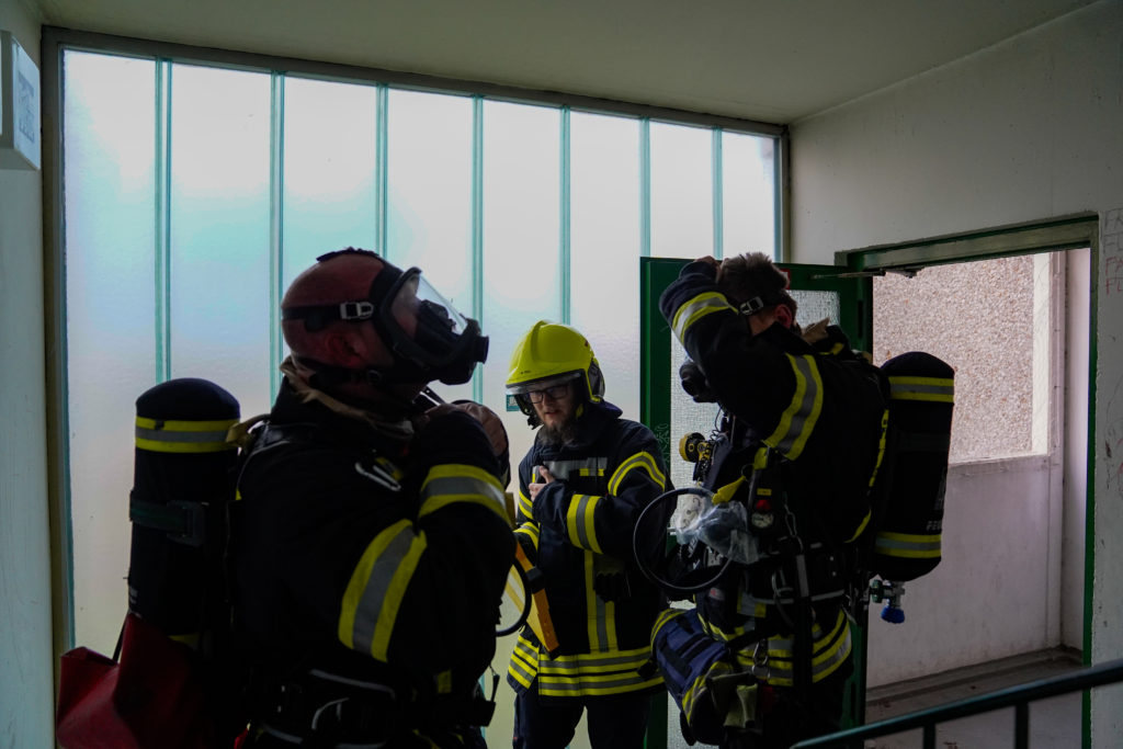 So nahm die unangekündigte Einsatzübung ihren Lauf. Auf dem Weg zum Dachgeschoss stieß die Besatzung des ersten Löschfahrzeuges auf eine verletzte, bewusstlose Person. Die weitere Erkundung ergab einen Wohnungsbrand im 18. Obergeschoss mit mehreren vermissten Personen. Daraufhin wurde das Einsatzstichwort auf „F2Y MFH – Feuer in einem Mehrfamilienhaus mit Menschenleben in Gefahr“ erhöht und weitere Kräfte (fiktiv) nachalarmiert.