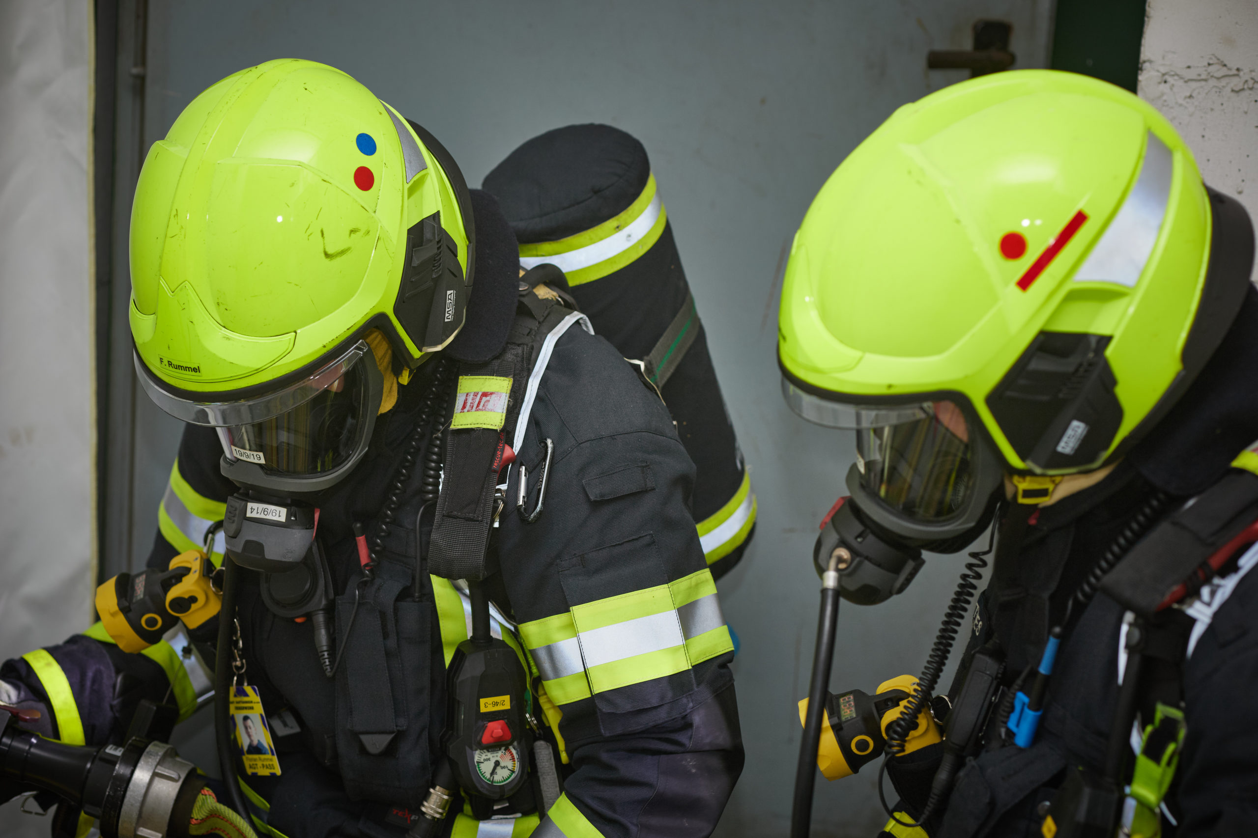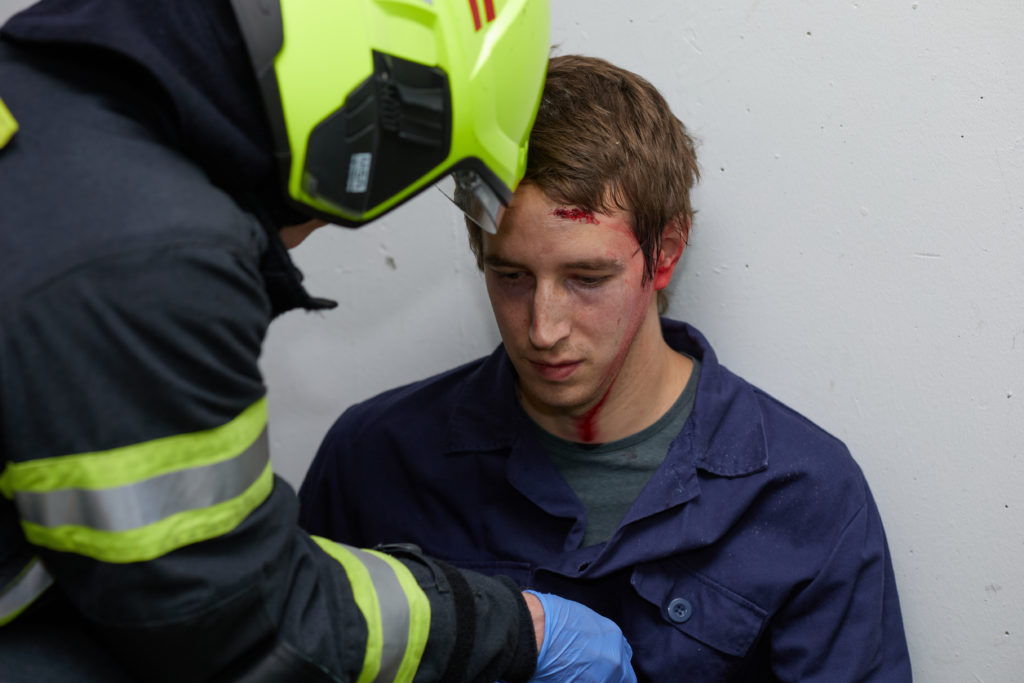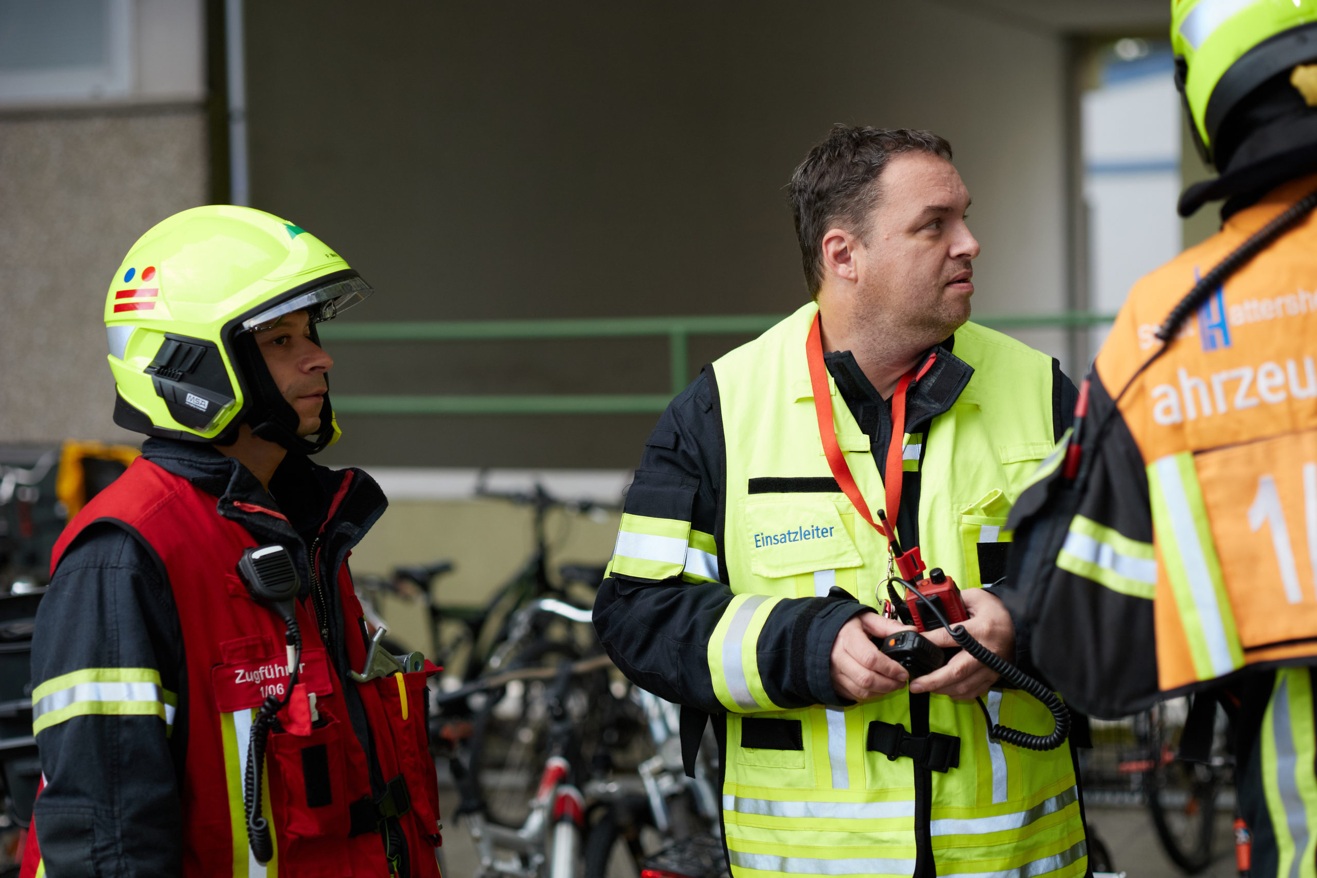 So nahm die unangekündigte Einsatzübung ihren Lauf. Auf dem Weg zum Dachgeschoss stieß die Besatzung des ersten Löschfahrzeuges auf eine verletzte, bewusstlose Person. Die weitere Erkundung ergab einen Wohnungsbrand im 18. Obergeschoss mit mehreren vermissten Personen. Daraufhin wurde das Einsatzstichwort auf „F2Y MFH – Feuer in einem Mehrfamilienhaus mit Menschenleben in Gefahr“ erhöht und weitere Kräfte (fiktiv) nachalarmiert.