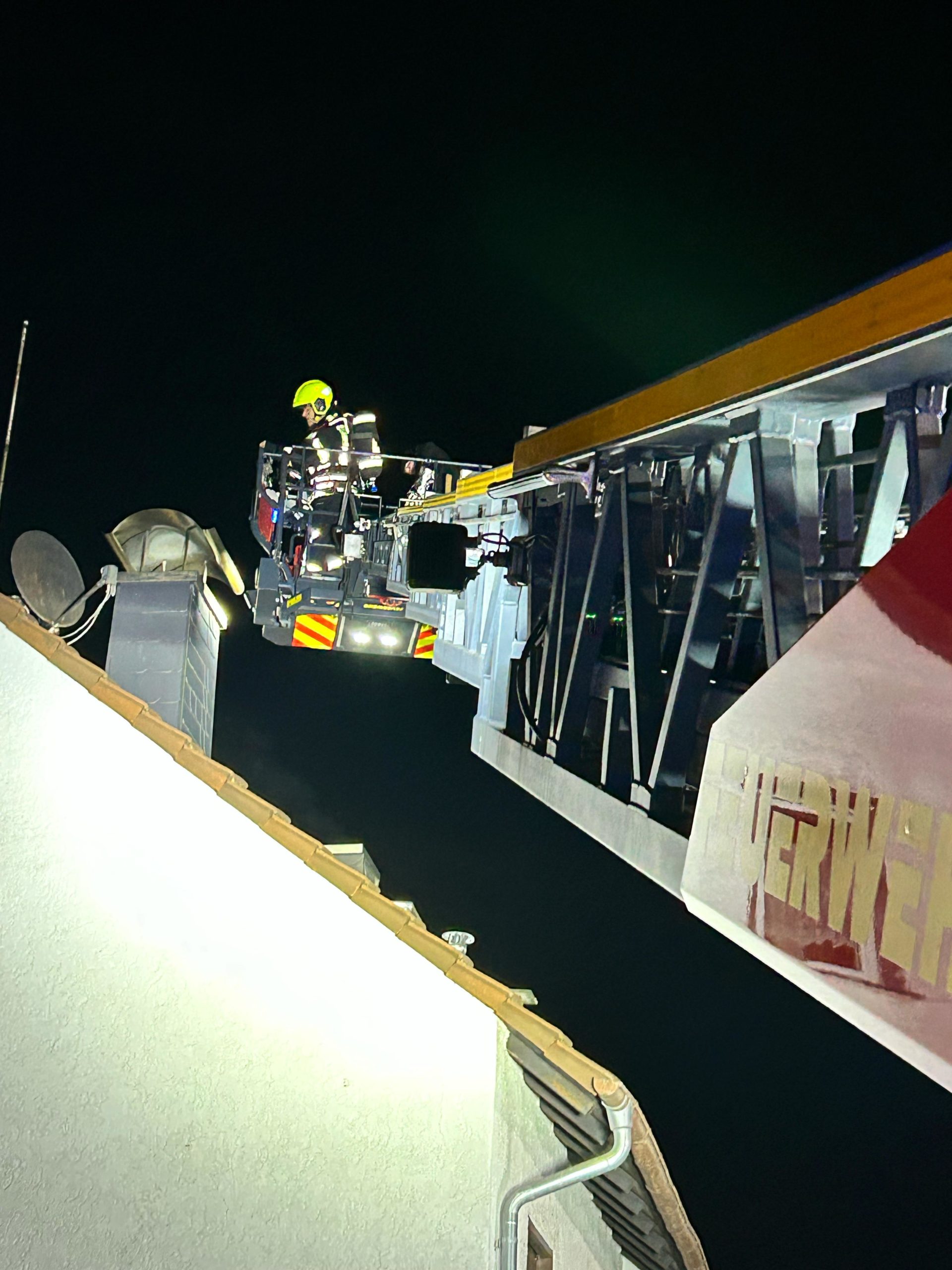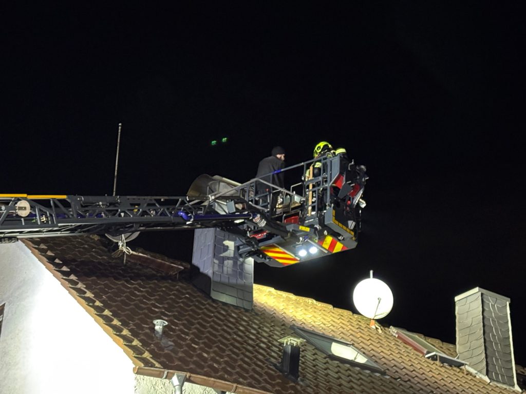 Der Schornsteinfeger entfernte von der Drehleiter aus den abgelagerten Ruß im Kamin. Ein Atemschutztrupp entfernte im Keller das Kehrgut aus der Revisionsöffnung, ein weiterer Atemschutztrupp kontrollierte die Temperatur des Kamins im Dachgeschoss. Nach rund eineinhalb Stunden war das Feuer gelöscht.