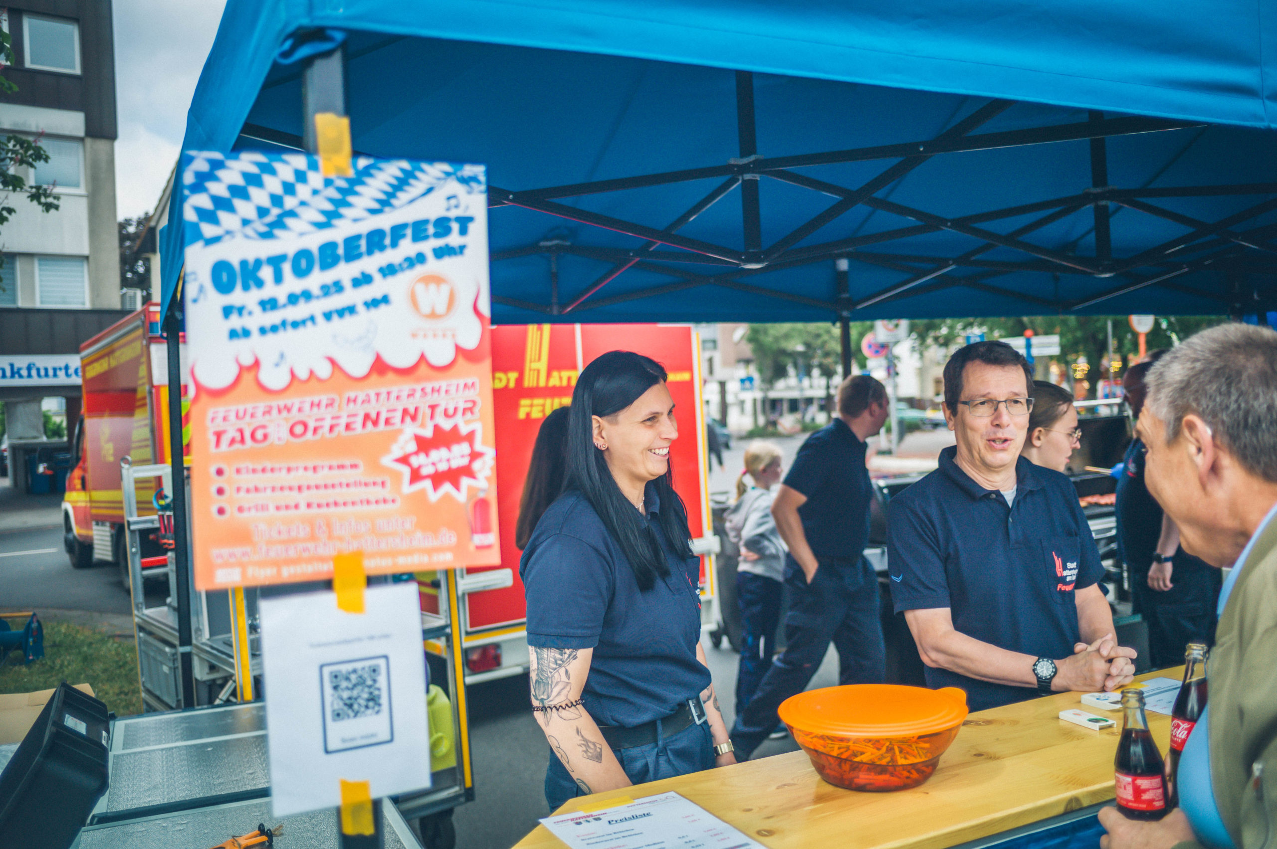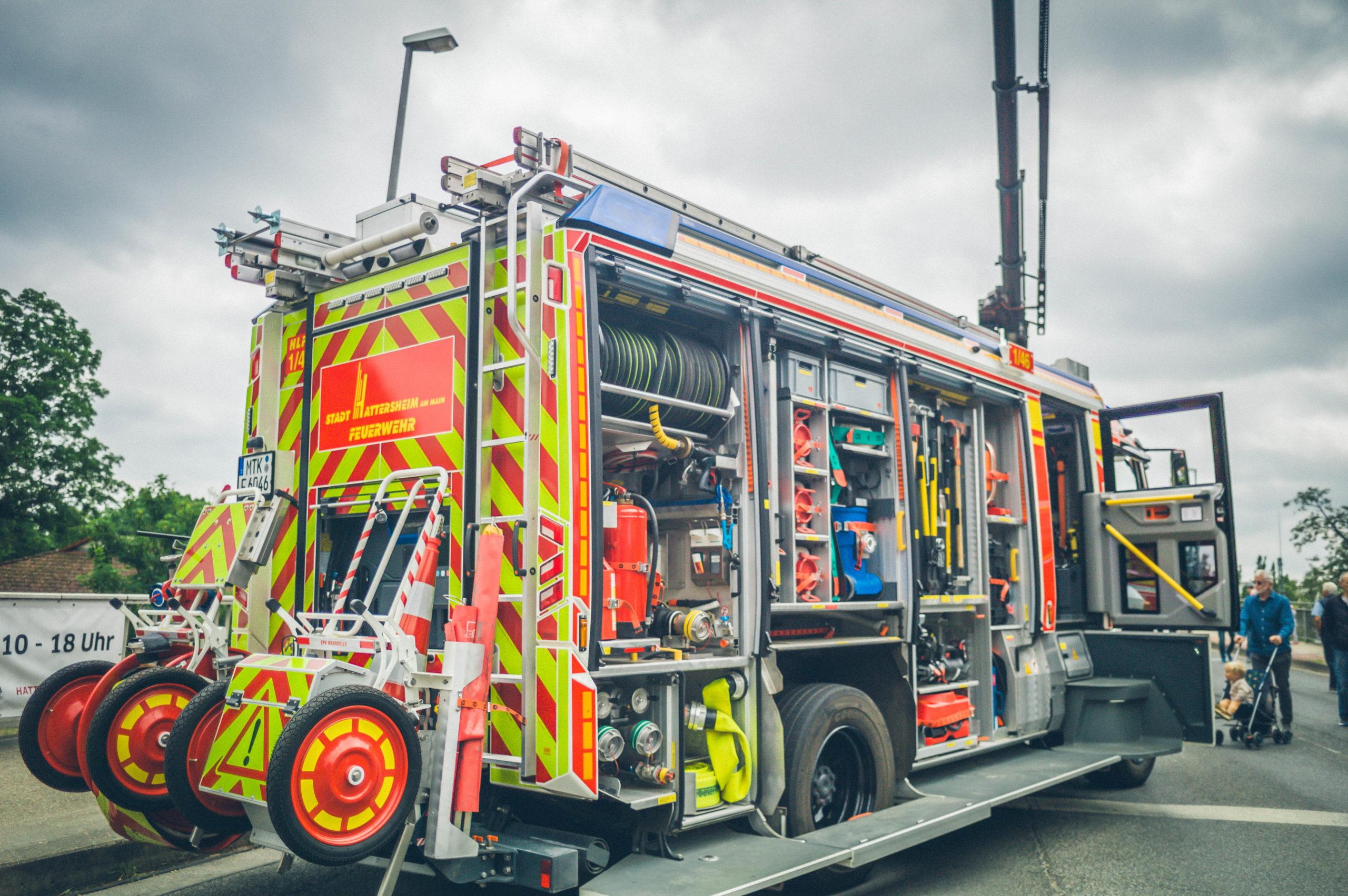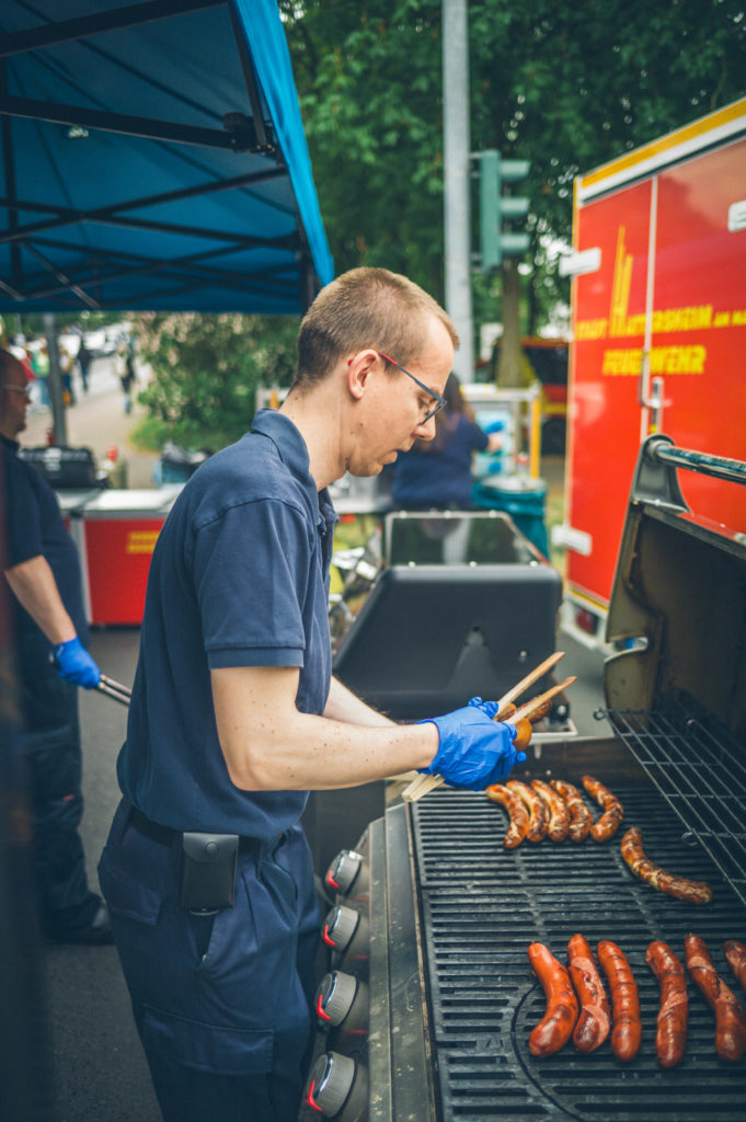 Bereits am Vormittag bildeten sich die ersten Schlangen am Grillstand, an dem unsere Einsatzkräfte leckere Würstchen und erfrischende Getränke servierten. Das kulinarische Angebot wurde durch spannende Einblicke in die moderne Technik der Hattersheimer Feuerwehren ergänzt: Das Hilfeleistungslöschfahrzeug, der Einsatzleitwagen mit neuem Drohnensystem sowie das Wechselladerfahrzeug mit Kran zogen zahlreiche Interessierte an – und standen den Gästen zur Besichtigung offen.