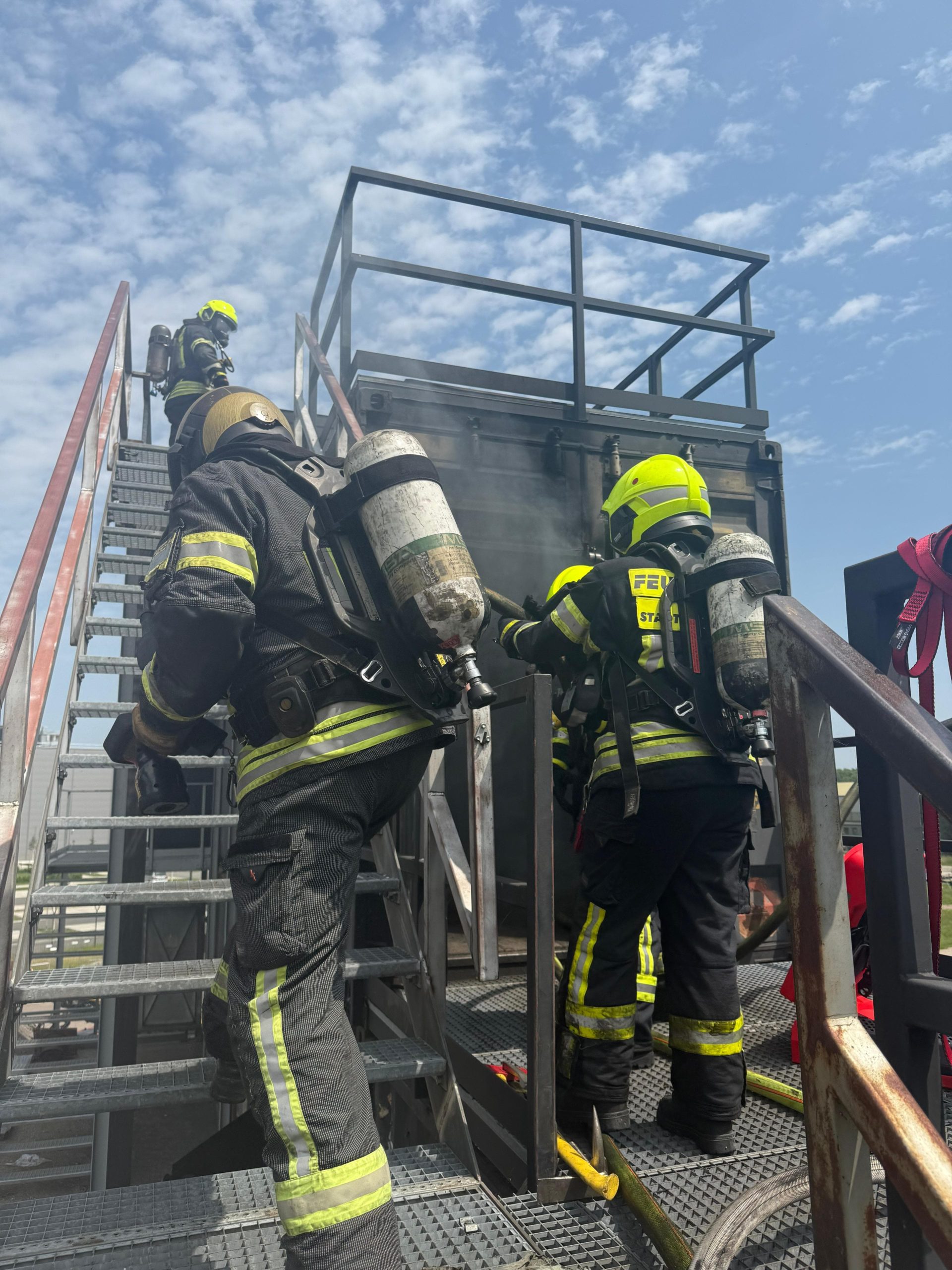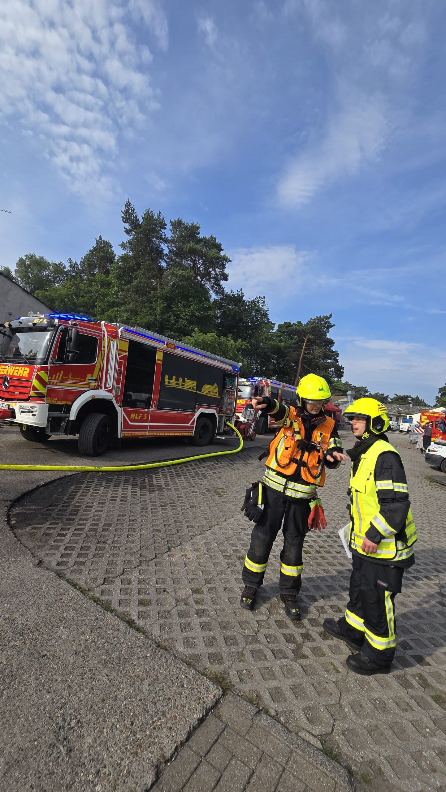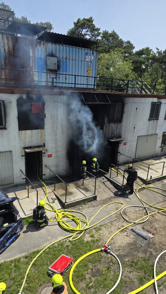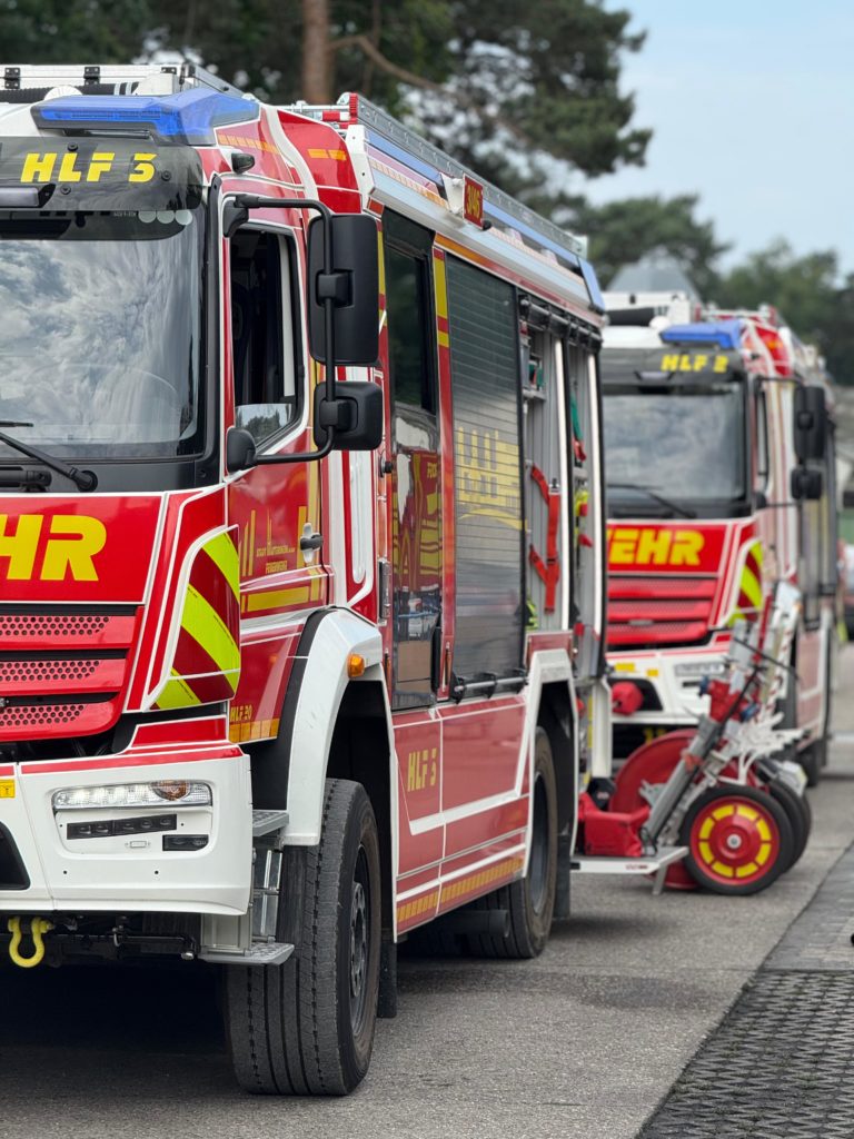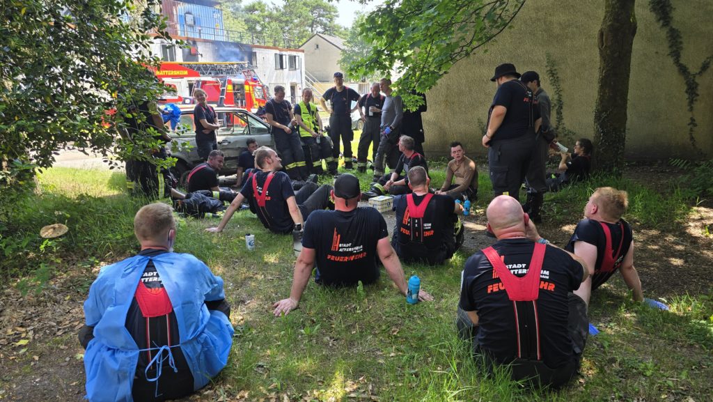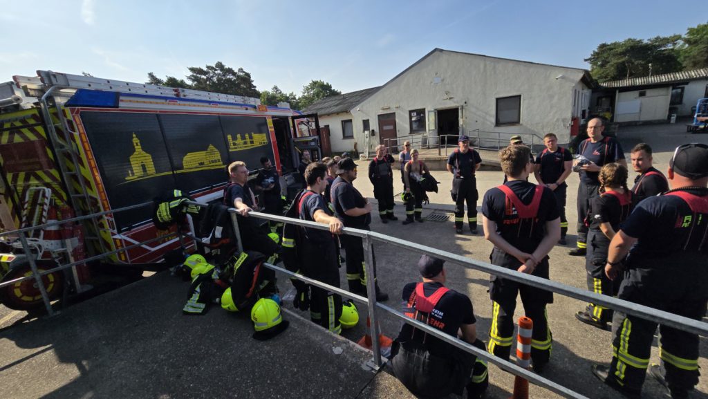 Bereits am Donnerstagnachmittag machten sich sieben Einsatzfahrzeuge auf den rund 300 Kilometer langen Weg zur deutsch-niederländischen Grenze. Auf dem ehemaligen Stützpunkt der Royal Air Force erwarteten die Feuerwehrkräfte realitätsnahe Übungsszenarien mit echtem Feuer, starker Verrauchung sowie hoher physischer und psychischer Belastung – erschwert durch hochsommerliche Temperaturen von über 30 °C, die die Einsatzübungen zusätzlich fordernd machten. Die Kombination aus Hitzebelastung, Schutzkleidung, Atemschutz und intensiver körperlicher Beanspruchung kam damit echten Einsatzbedingungen sehr nahe.