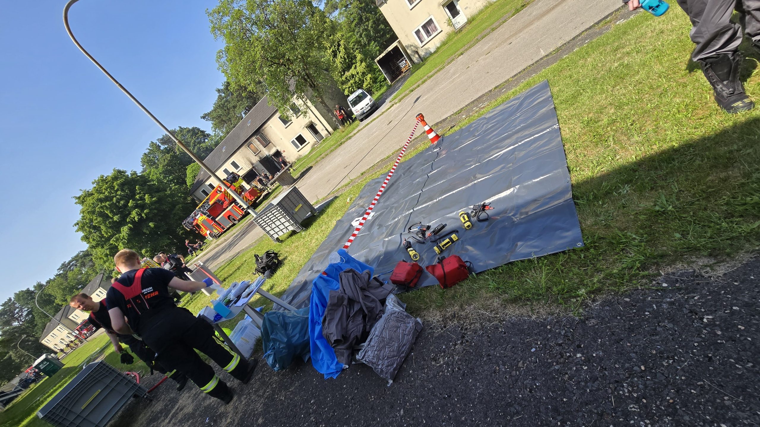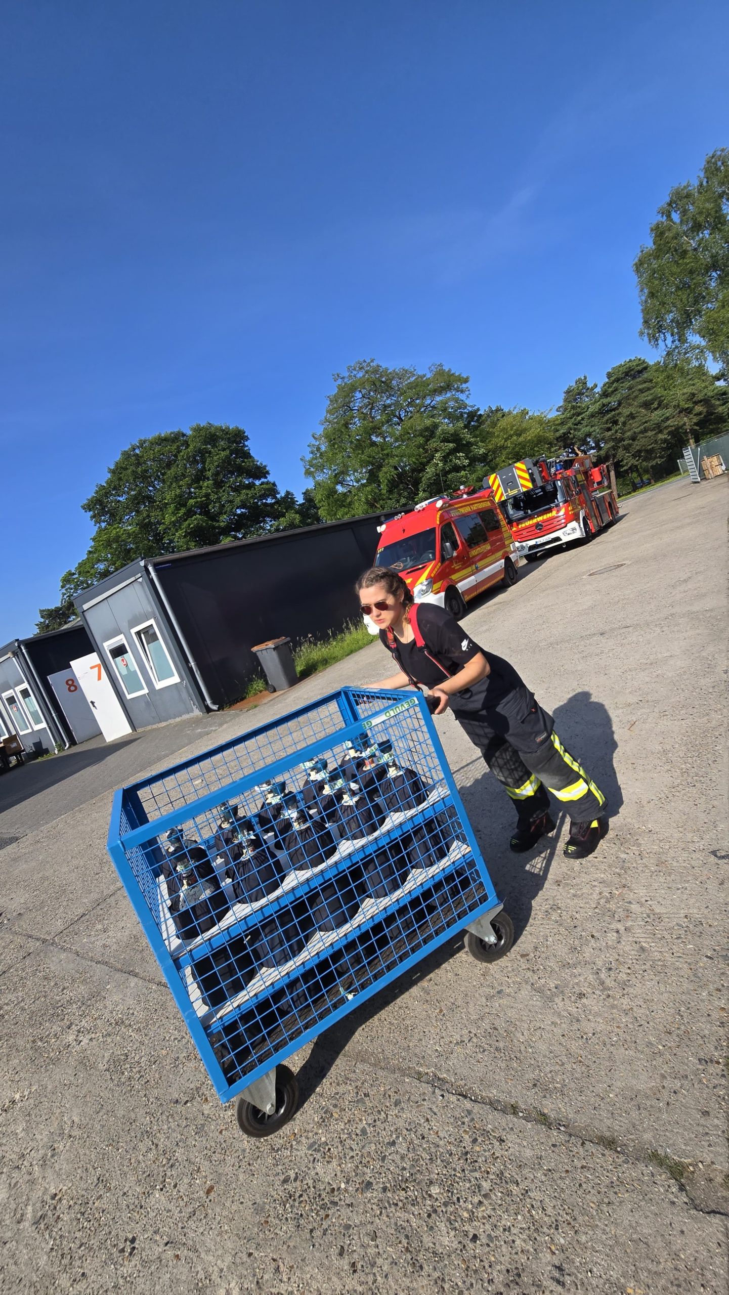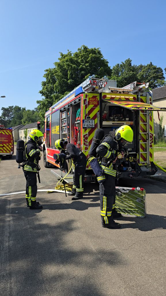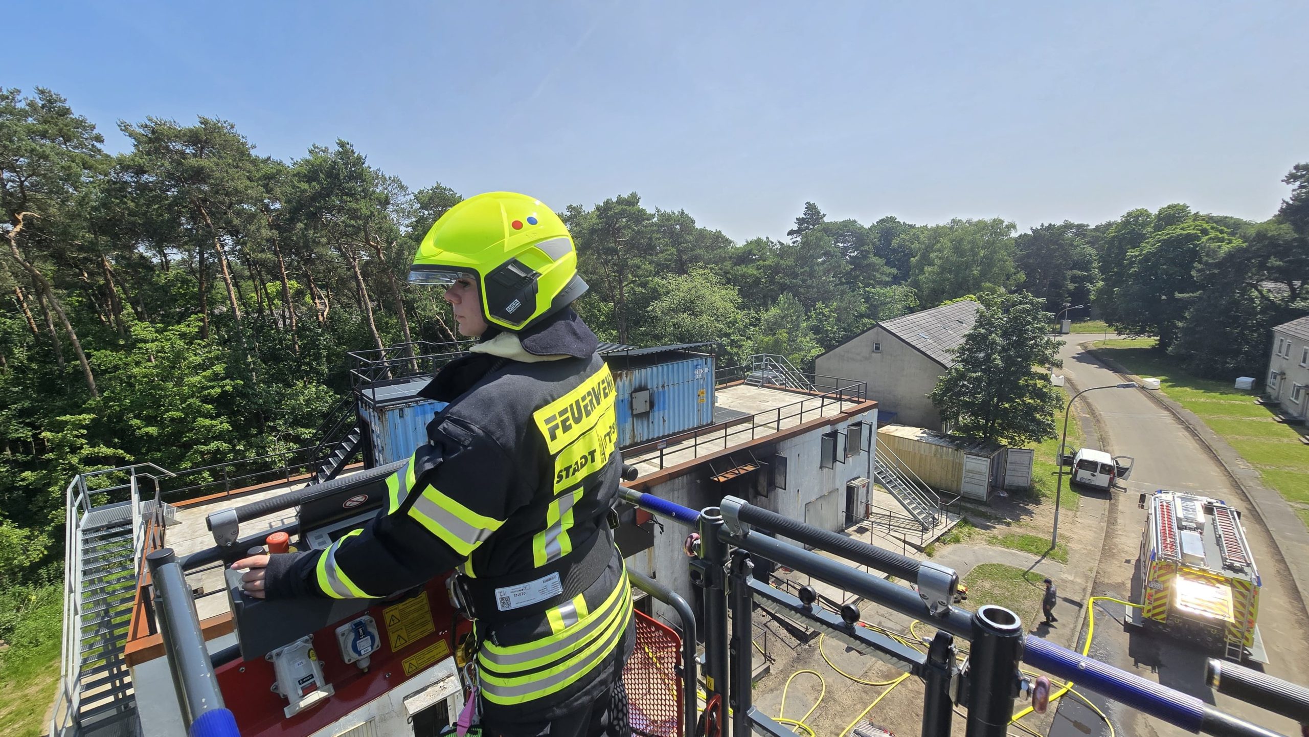 Bereits am Donnerstagnachmittag machten sich sieben Einsatzfahrzeuge auf den rund 300 Kilometer langen Weg zur deutsch-niederländischen Grenze. Auf dem ehemaligen Stützpunkt der Royal Air Force erwarteten die Feuerwehrkräfte realitätsnahe Übungsszenarien mit echtem Feuer, starker Verrauchung sowie hoher physischer und psychischer Belastung – erschwert durch hochsommerliche Temperaturen von über 30 °C, die die Einsatzübungen zusätzlich fordernd machten. Die Kombination aus Hitzebelastung, Schutzkleidung, Atemschutz und intensiver körperlicher Beanspruchung kam damit echten Einsatzbedingungen sehr nahe.