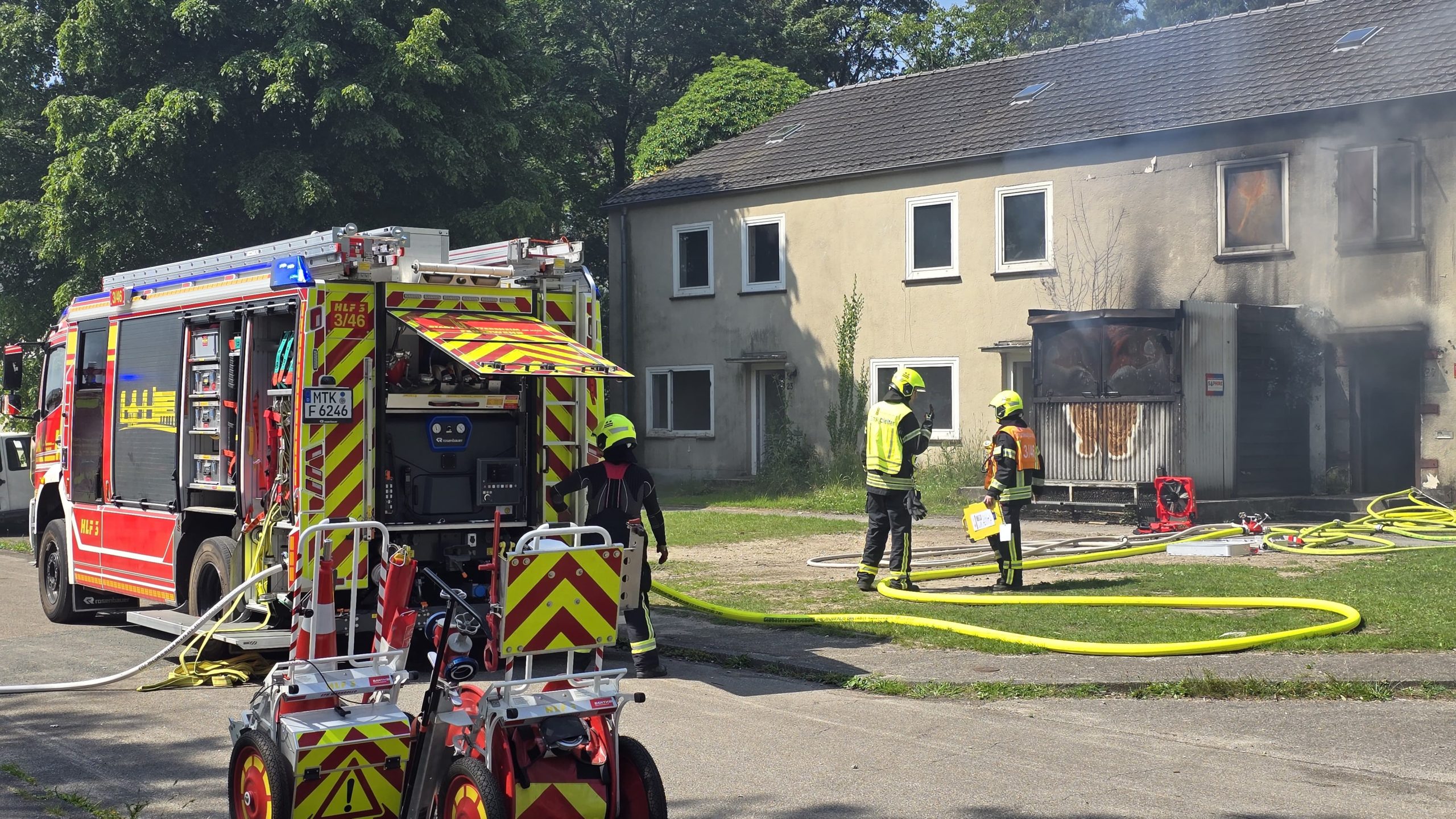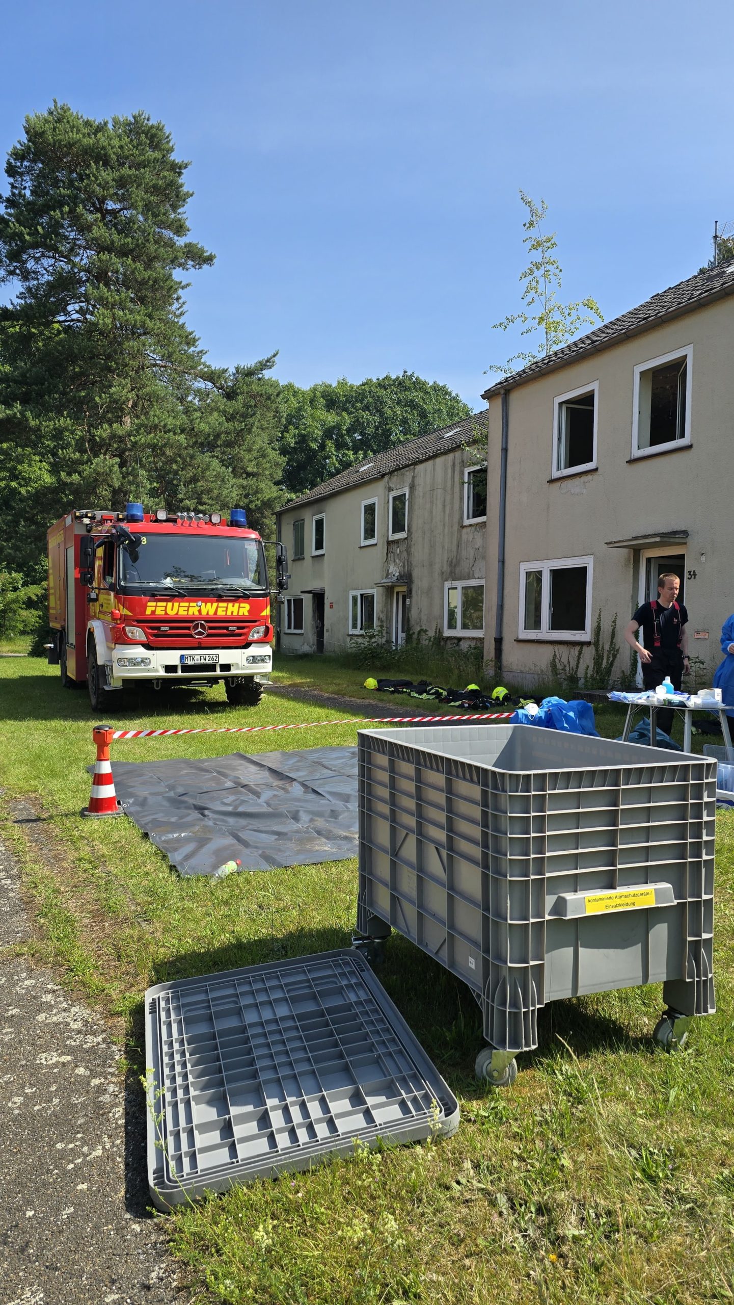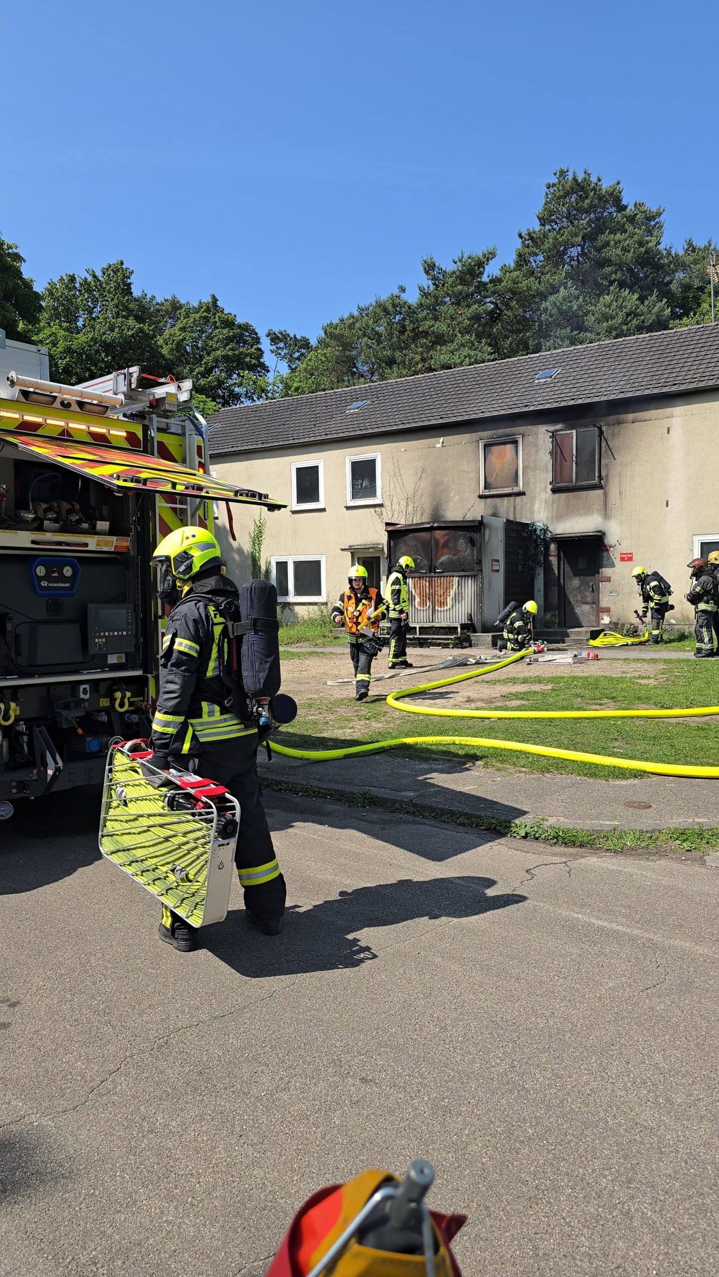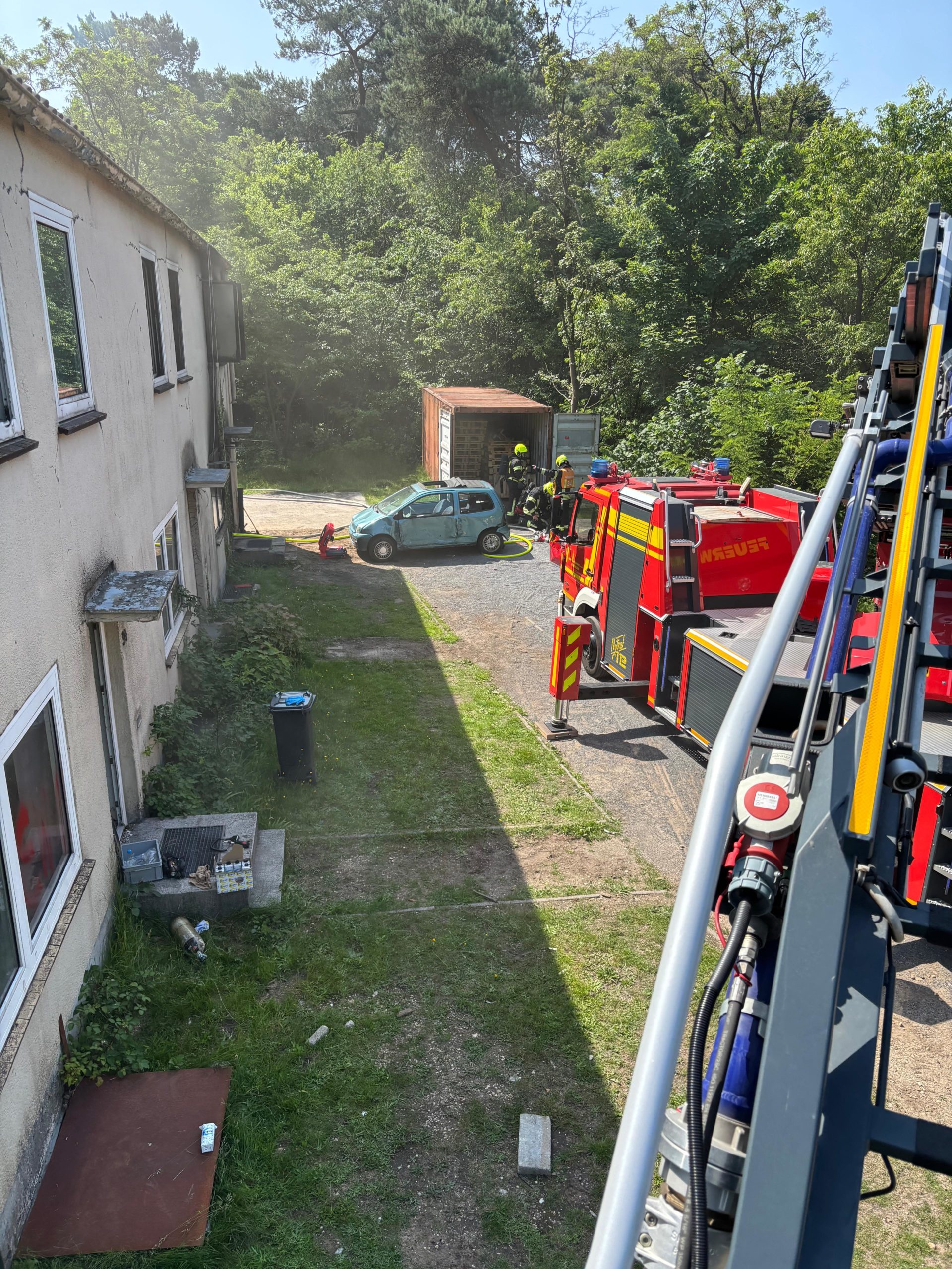 Bereits am Donnerstagnachmittag machten sich sieben Einsatzfahrzeuge auf den rund 300 Kilometer langen Weg zur deutsch-niederländischen Grenze. Auf dem ehemaligen Stützpunkt der Royal Air Force erwarteten die Feuerwehrkräfte realitätsnahe Übungsszenarien mit echtem Feuer, starker Verrauchung sowie hoher physischer und psychischer Belastung – erschwert durch hochsommerliche Temperaturen von über 30 °C, die die Einsatzübungen zusätzlich fordernd machten. Die Kombination aus Hitzebelastung, Schutzkleidung, Atemschutz und intensiver körperlicher Beanspruchung kam damit echten Einsatzbedingungen sehr nahe.