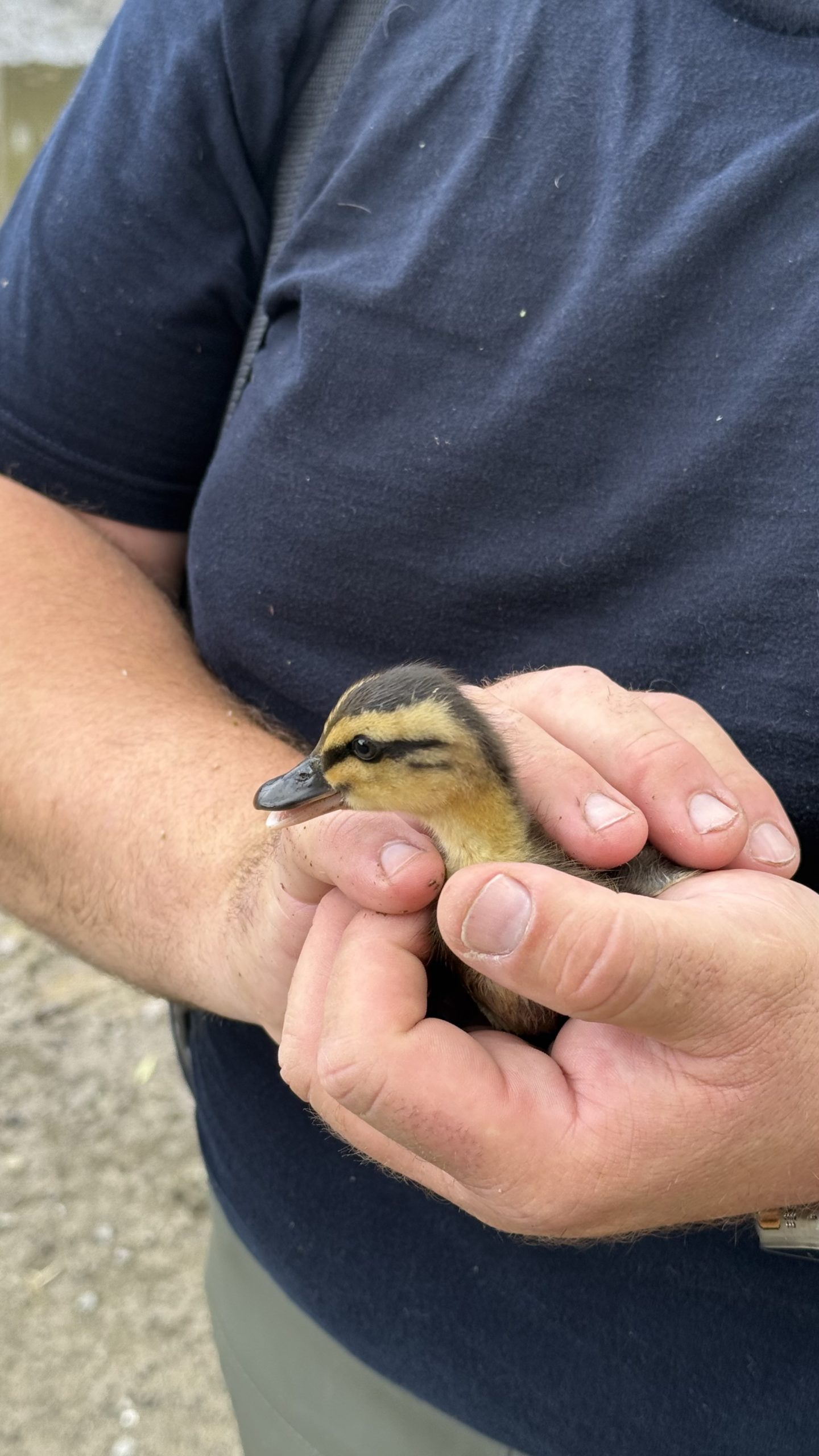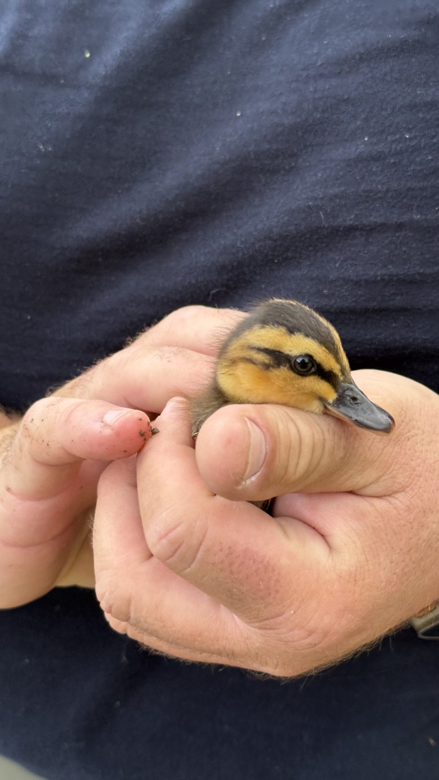 Vor Ort zeigte sich jedoch ein anderes Bild: Die Enten bewegten sich frei im Gelände, eine akute Gefahr bestand nicht. Um mögliche Gefährdungen durch die nahegelegenen Baggerarbeiten dennoch auszuschließen, versuchten die Einsatzkräfte einen behutsamen Einfang der Tiere. Einige Küken konnten vorübergehend gesichert werden, während die Entenmutter wiederholt davon flog. Andere Jungtiere flüchteten eigenständig ins schützende Schilf.