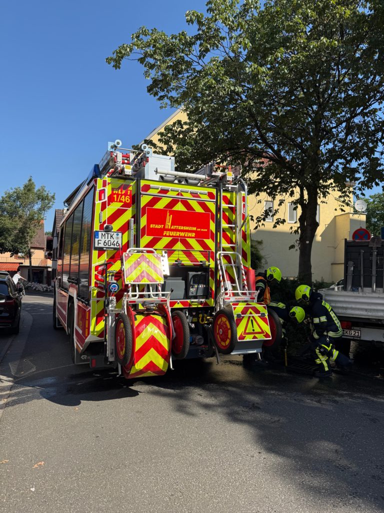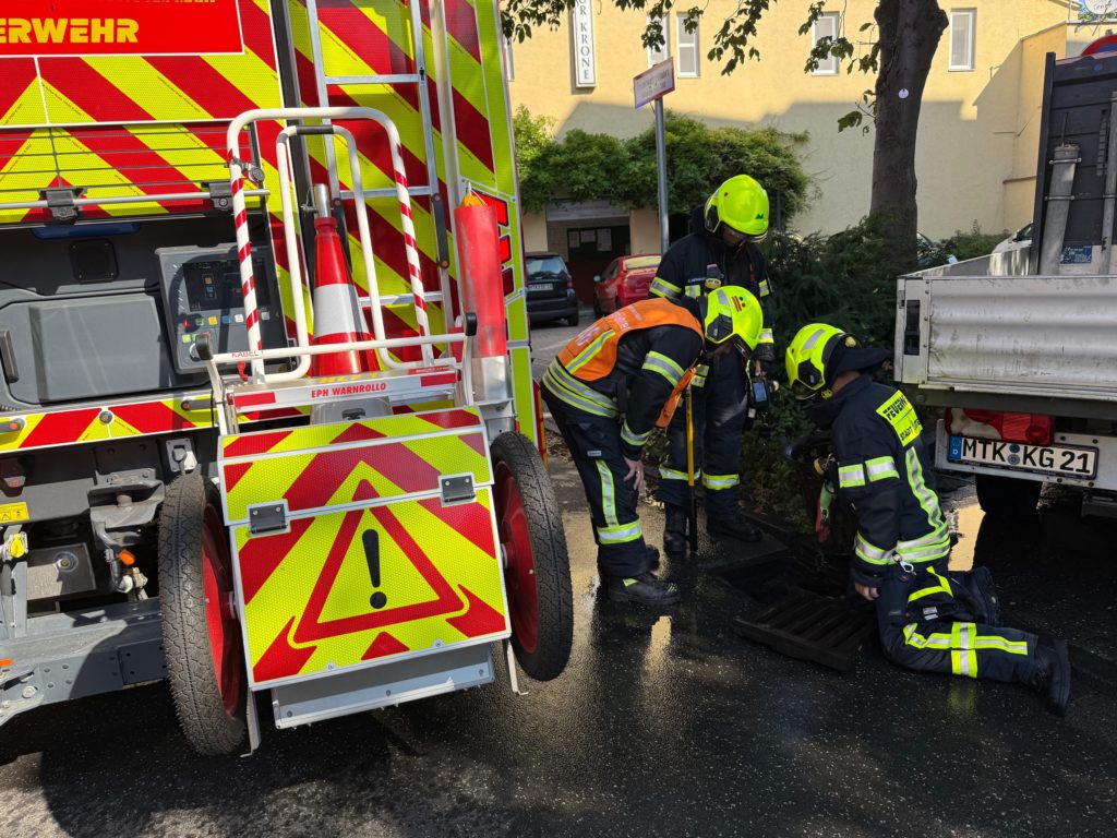 Der erste Einsatz des Tages erfolgte um 09:25 Uhr in der Hattersheimer Hauptstraße. In einem Straßenablauf war ein Feuer ausgebrochen, das noch vor Eintreffen der Feuerwehr von Mitarbeitenden einer Bäckerei mit eigenen Mitteln weitgehend gelöscht werden konnte. Die Feuerwehrkräfte kontrollierten den betroffenen Sinkkasten mit der Wärmebildkamera und führte Nachlöscharbeiten durch, um Glutnester abzulöschen und eine erneute Brandentwicklung auszuschließen.