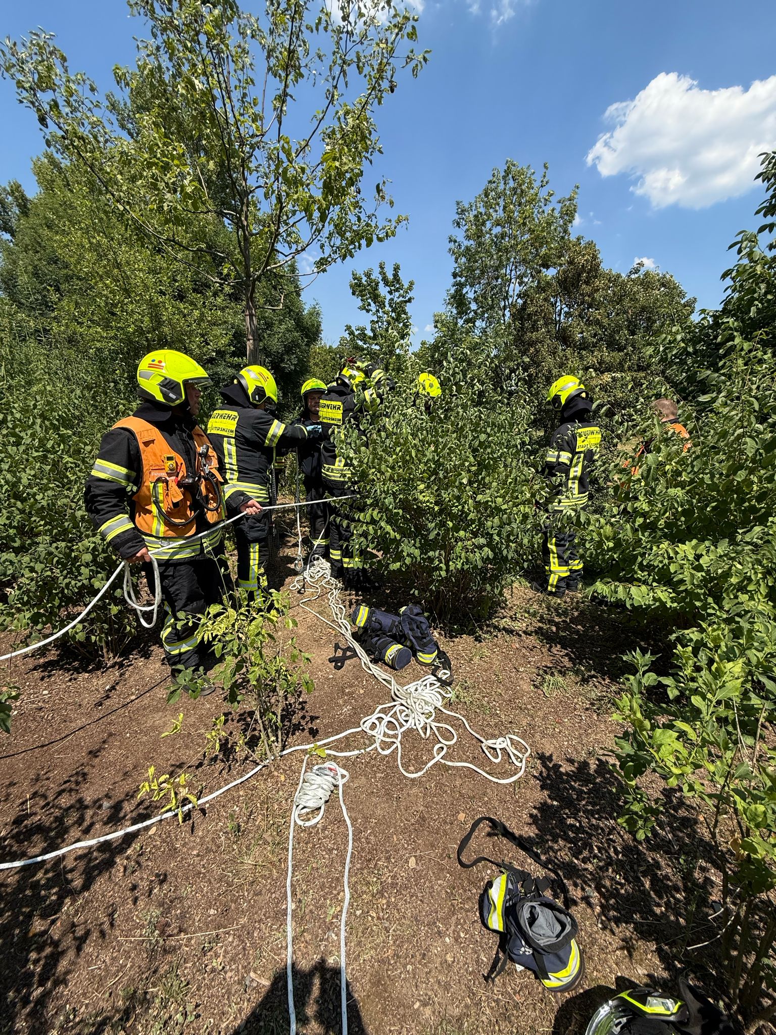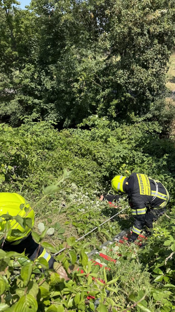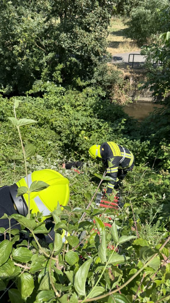 Um 13:46 Uhr erfolgte die Alarmierung zu einer Personenrettung im Bereich „An der Ölmühle“. Zwei Passanten hatten Hilferufe aus einer Böschung vernommen und den Notruf gewählt. Eine Person war hangabwärts in ein dichtes Dornengestrüpp gestürzt und konnte sich nicht mehr selbstständig befreien. Die Feuerwehr rettete die verletzte Person über eine Steckleiter und übergab sie an den Rettungsdienst, der eine medizinische Versorgung und den Transport in ein Krankenhaus übernahm. Auch der Hund der betroffenen Person wurde von der Feuerwehr in Obhut genommen und später durch Angehörige auf der Feuerwache abgeholt.