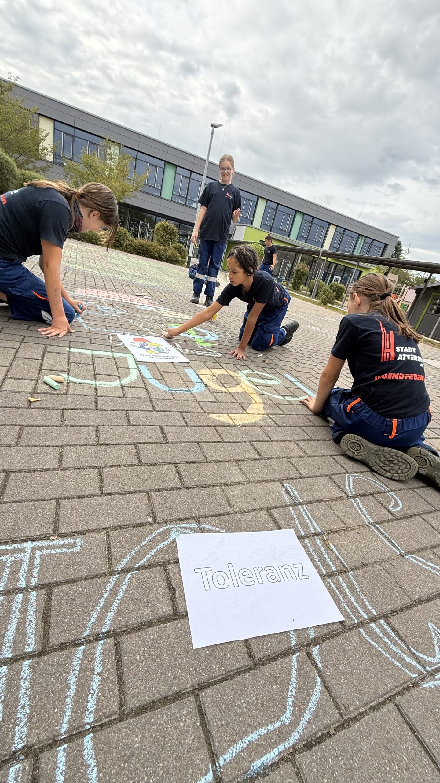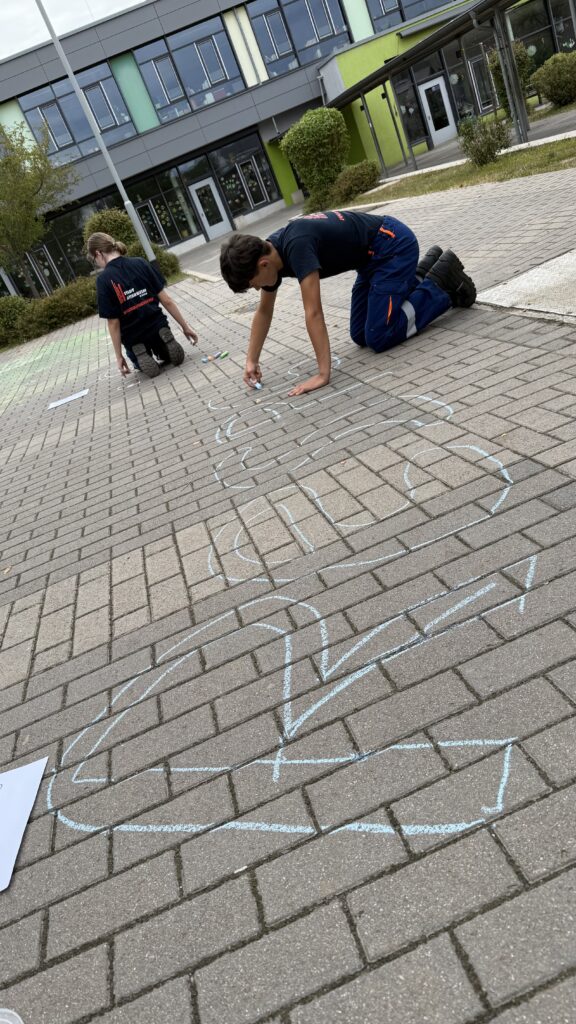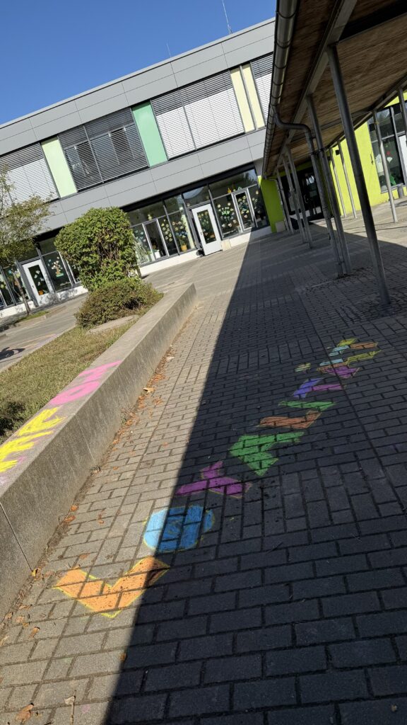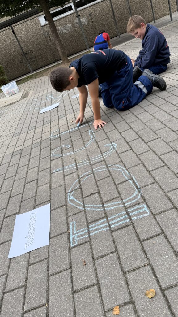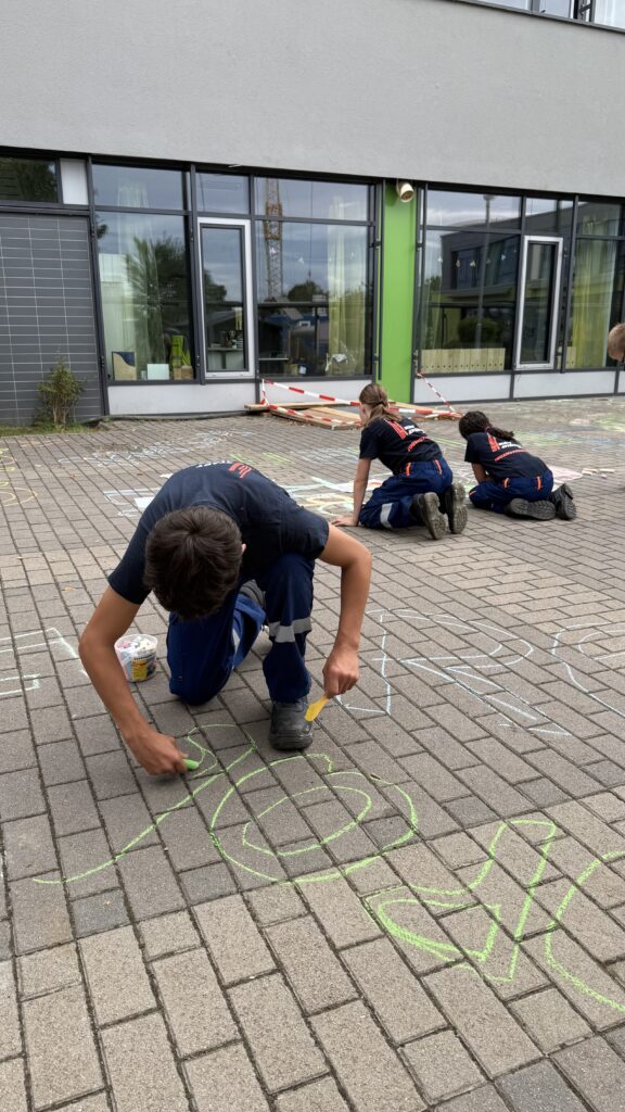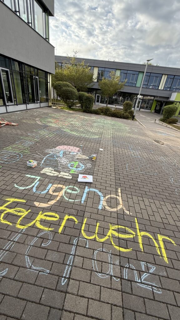 Am nächsten Morgen wurden die bunt umrissenen Begriffe von den Schülerinnen und Schülern mit Leben gefüllt – im wahrsten Sinne des Wortes. Mit farbiger Kreide gestalteten die Kinder die Begriffe kreativ aus und setzten sich anschließend im Unterricht mit ihrer Bedeutung auseinander. Die Werte bilden zugleich die Grundlage des Miteinanders in der Jugendfeuerwehr – eine Gemeinschaft, in der Respekt, Zusammenhalt und Mitbestimmung aktiv gelebt werden.