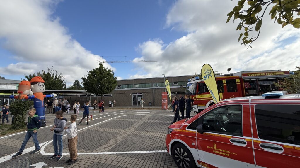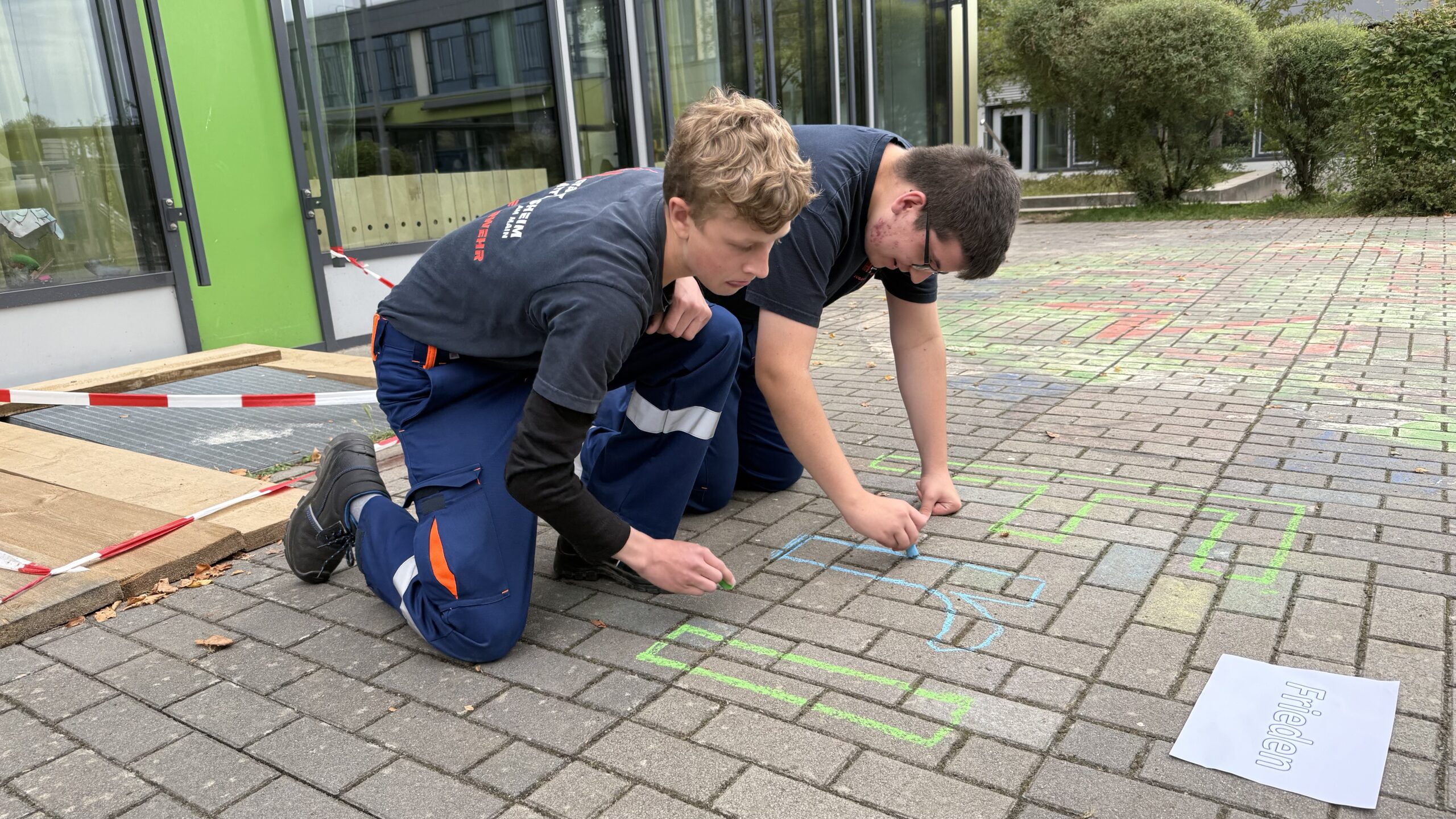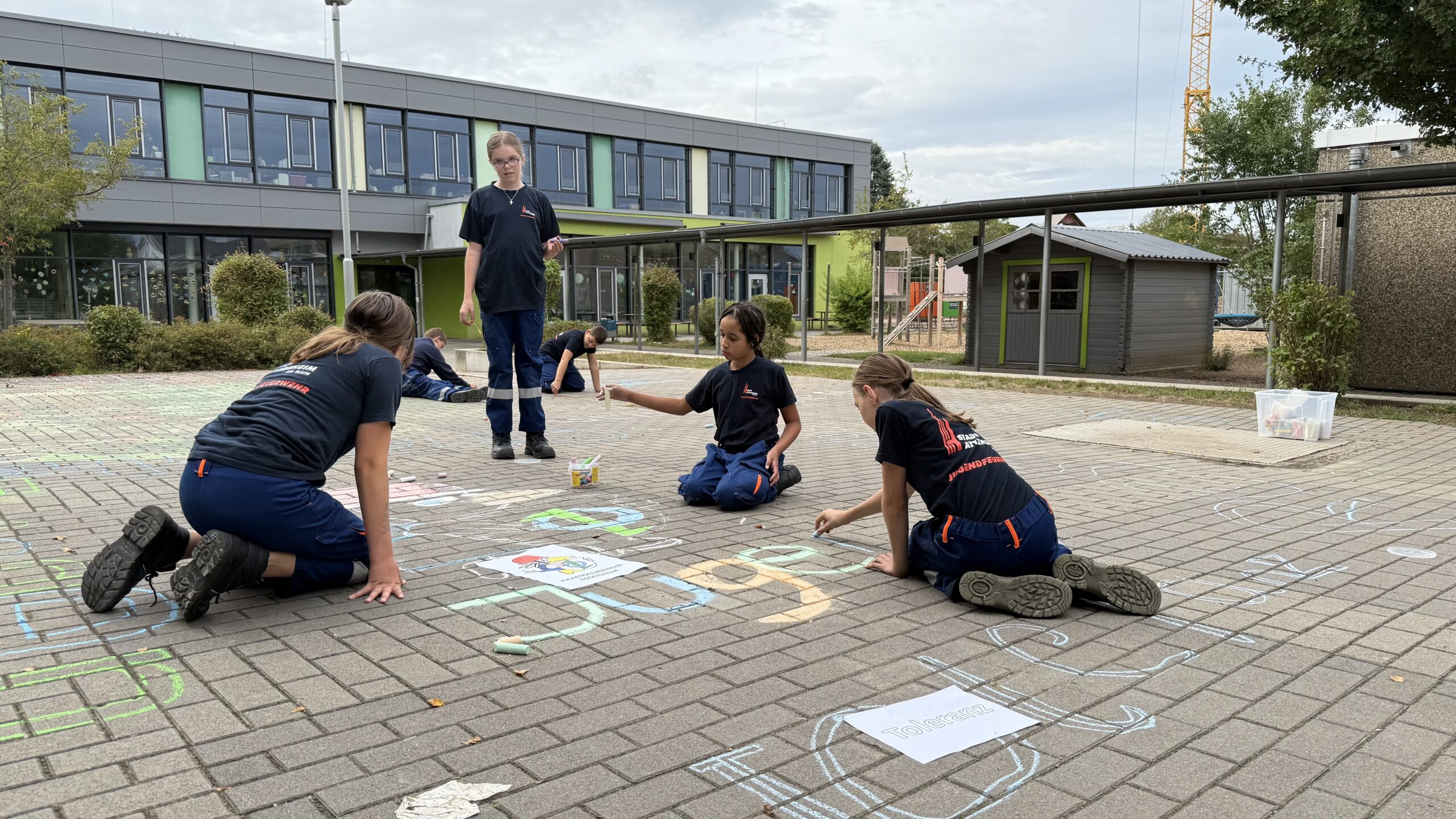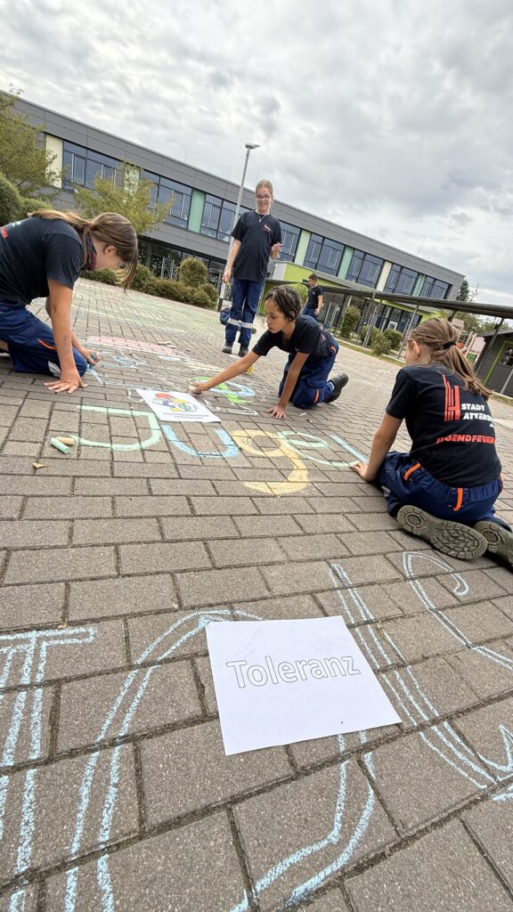 Mit Straßenmalkreide für Demokratie – unter diesem Motto beteiligten sich die Jugendfeuerwehren der Stadt Hattersheim am Main am hessenweiten Aktionstag „Jugendfeuerwehr ist WERTvoll“. Bereits am Vorabend, dem 28. August, haben Mitglieder der Jugendfeuerwehr Eddersheim gemeinsam mit Stadtjugendfeuerwehrwartin Svenja Baum und Jugendfeuerwehrwart Sebastian Zengeler zentrale demokratische Werte wie Freiheit, Respekt, Gerechtigkeit, Frieden, Toleranz und Bildung auf den Schulhof der Eddersheimer Schule geschrieben.
