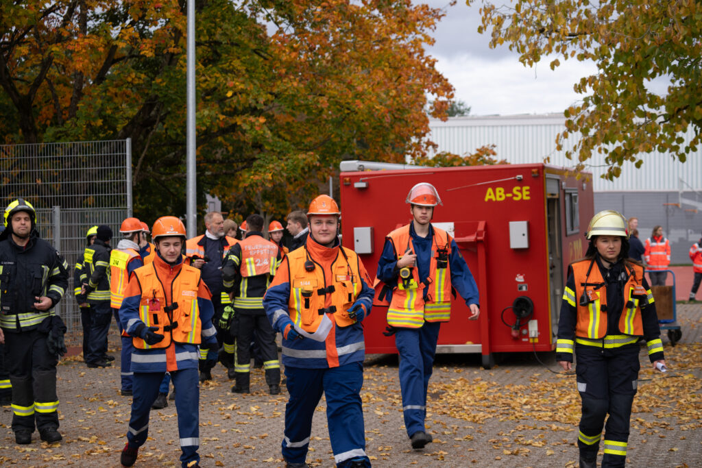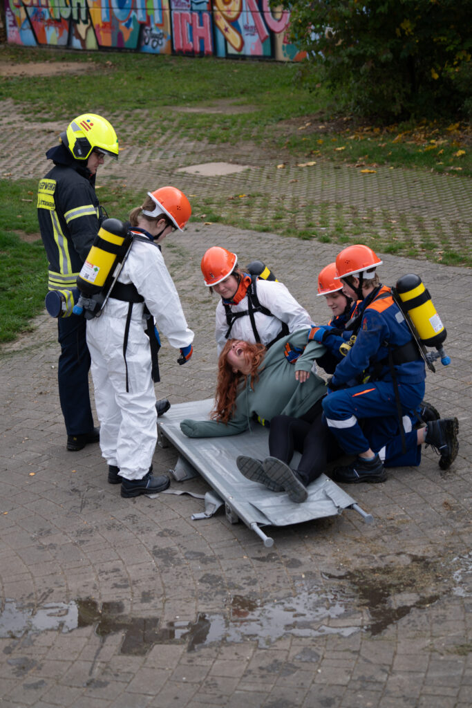 Auf dem Übungsplan standen gleich mehrere realitätsnahe Szenarien: ein Großbrand, ein Gefahrstoffeinsatz, eine aufwendige Wasserversorgung sowie die Rettung mehrerer vermisster Personen aus dem Schulgebäude. Mit großem Engagement zeigten die Jugendlichen, was sie im Laufe des Jahres gelernt hatten – darunter die Rettung über Steckleitern, den sicheren Umgang mit Gefahrstoffen und das strukturierte Absuchen von Gebäuden.