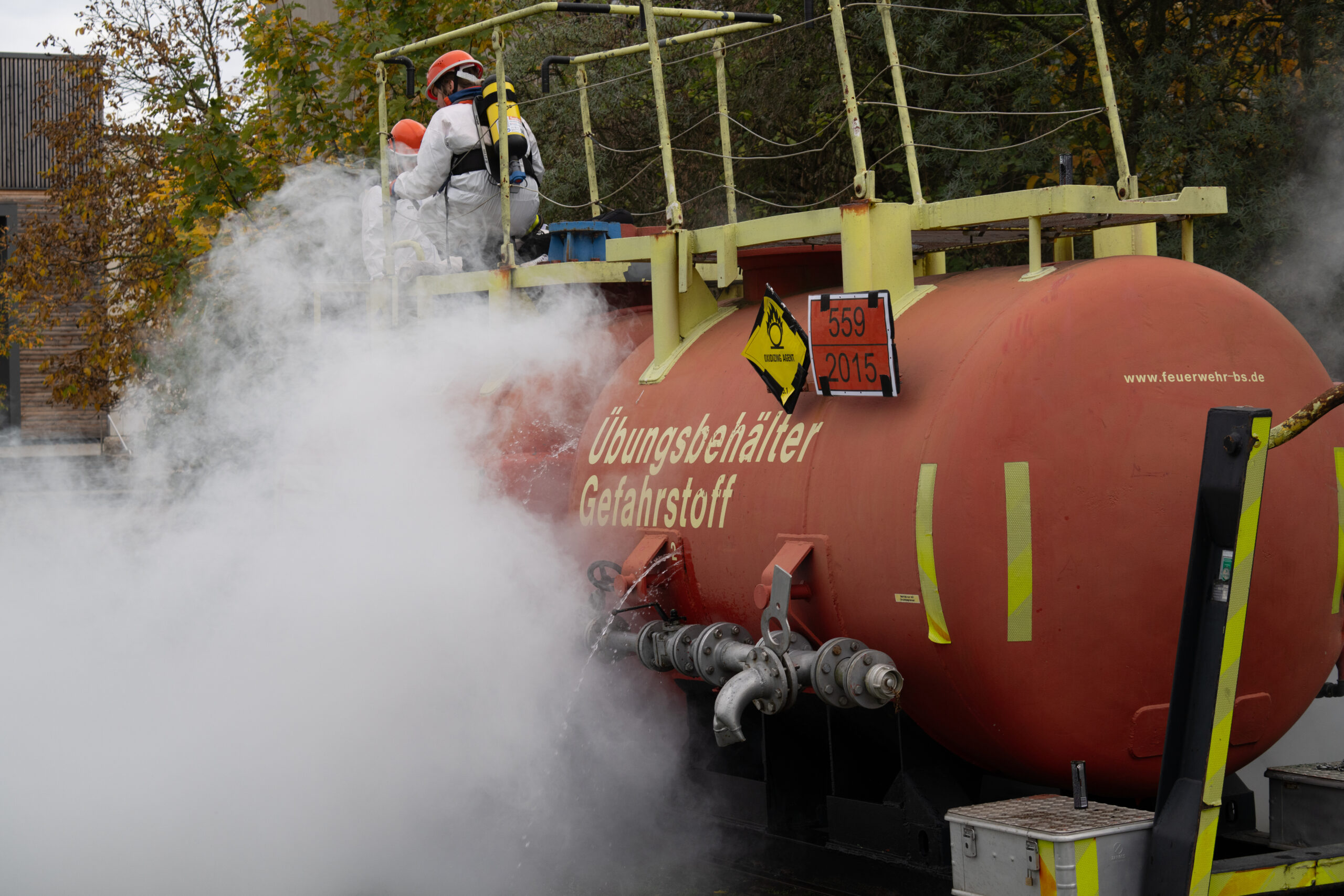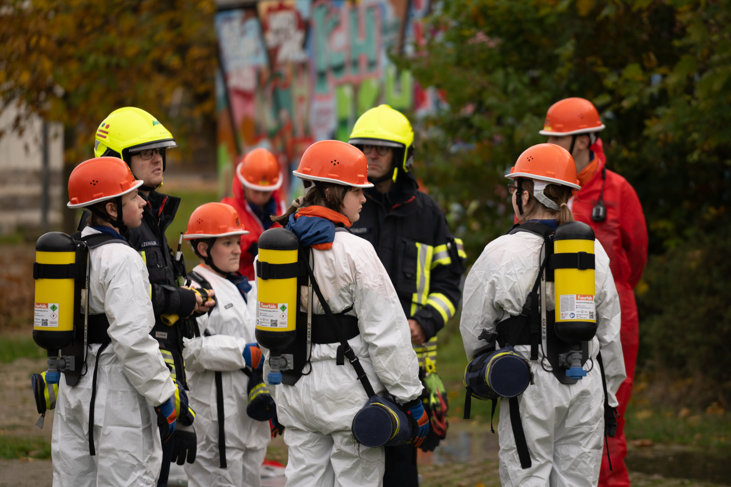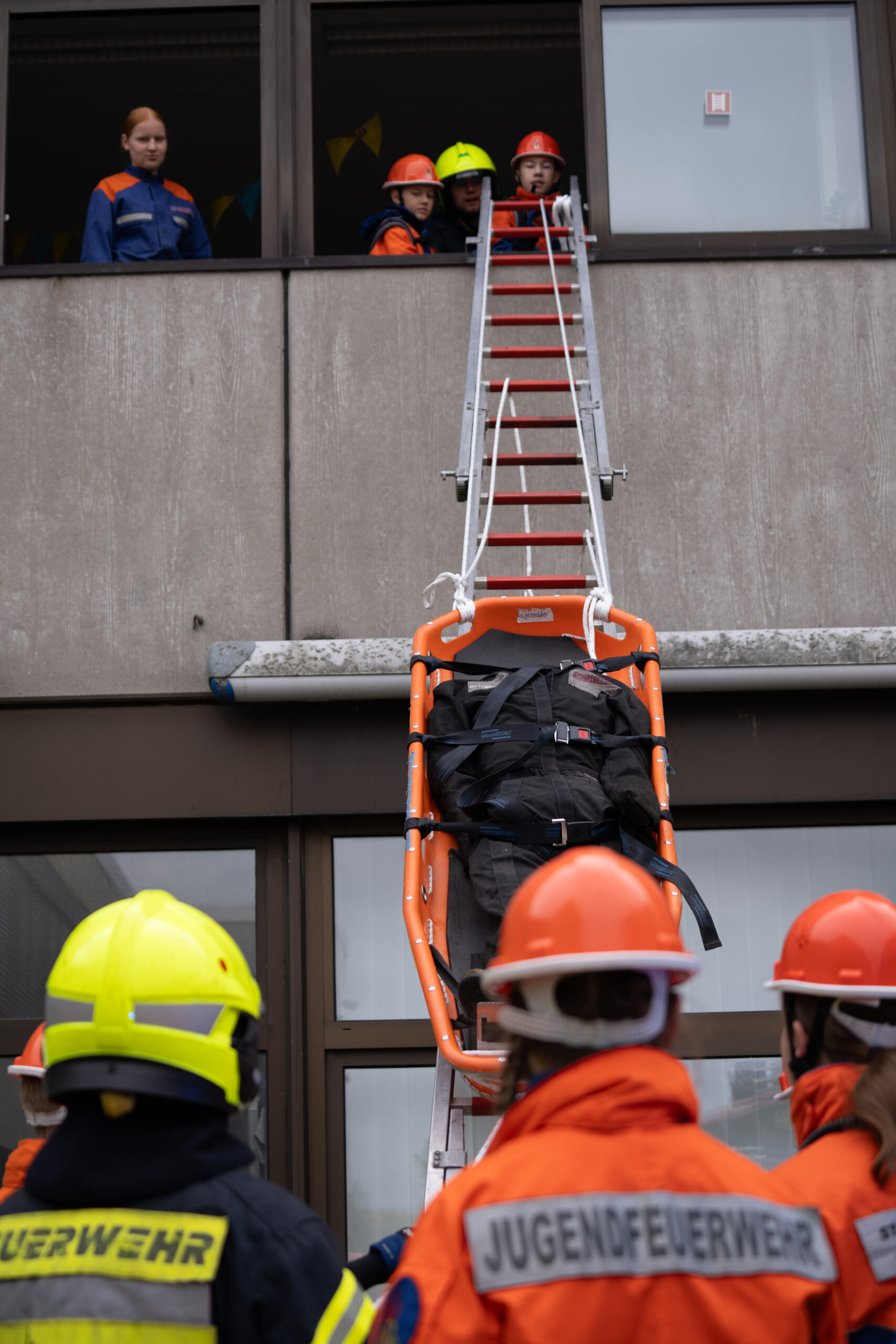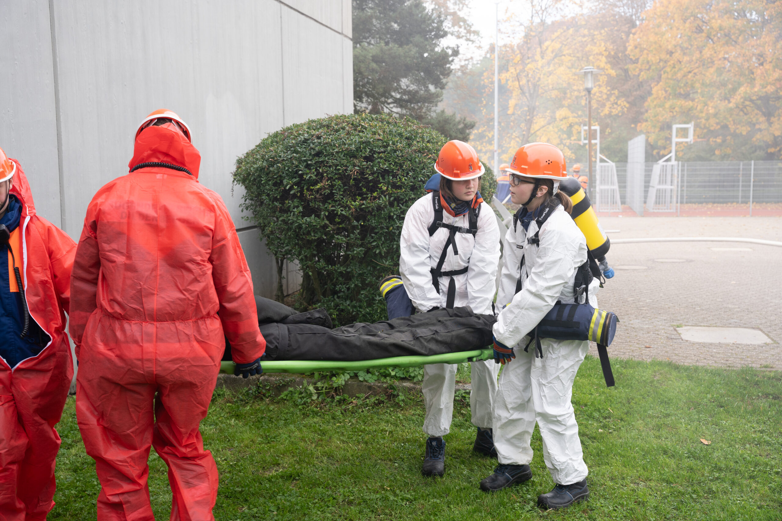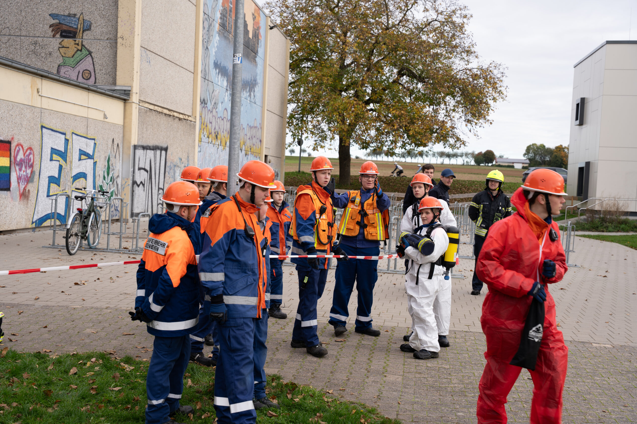 Auf dem Übungsplan standen gleich mehrere realitätsnahe Szenarien: ein Großbrand, ein Gefahrstoffeinsatz, eine aufwendige Wasserversorgung sowie die Rettung mehrerer vermisster Personen aus dem Schulgebäude. Mit großem Engagement zeigten die Jugendlichen, was sie im Laufe des Jahres gelernt hatten – darunter die Rettung über Steckleitern, den sicheren Umgang mit Gefahrstoffen und das strukturierte Absuchen von Gebäuden.