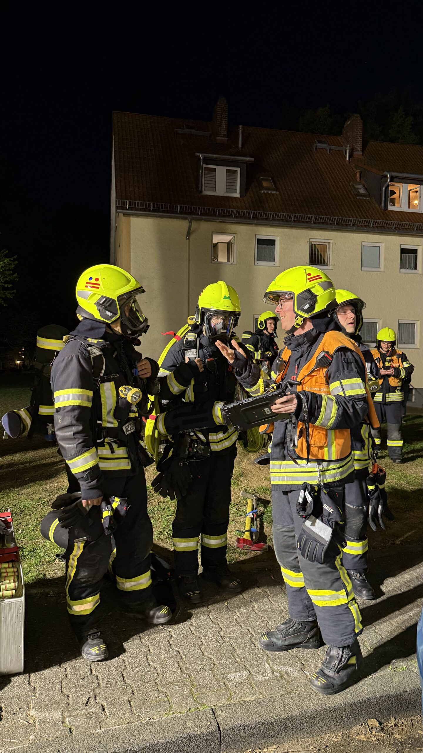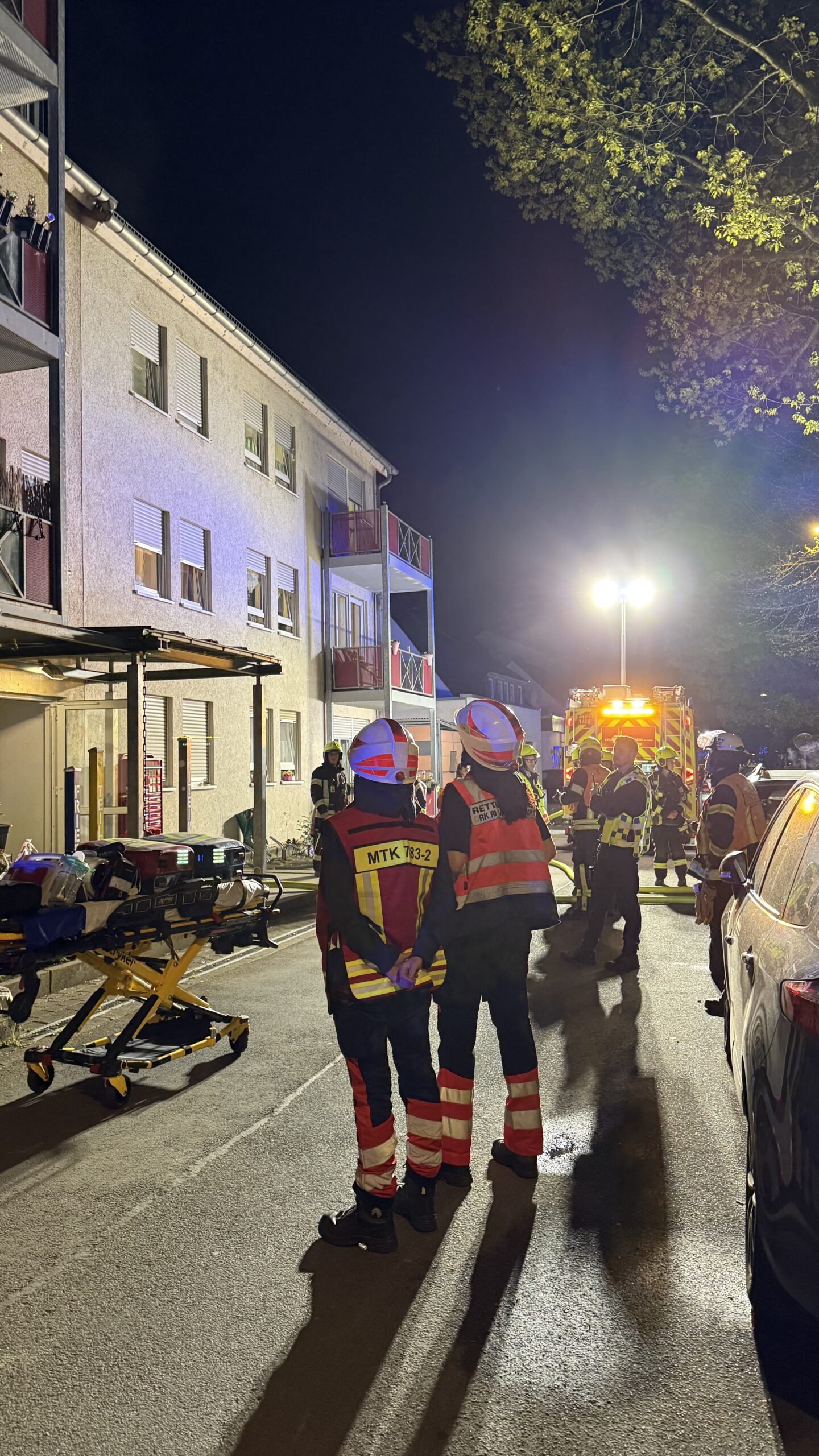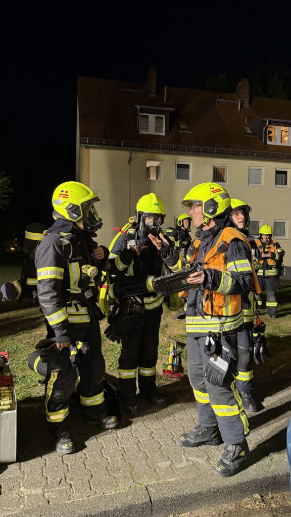 Ein Trupp unter Atemschutz führte im Anschluss Nachlöscharbeiten durch, brachte die verbrannten Gegenstände ins Freie und kontrollierte die Brandstelle auf mögliche Glutnester. Parallel wurde die betroffene Wohnung umfassend belüftet, um den Brandrauch zu entfernen. Auch die darüberliegende Wohnung wurde vorsorglich kontrolliert. Der Treppenraum des Mehrfamilienhauses wurde ebenfalls entraucht.