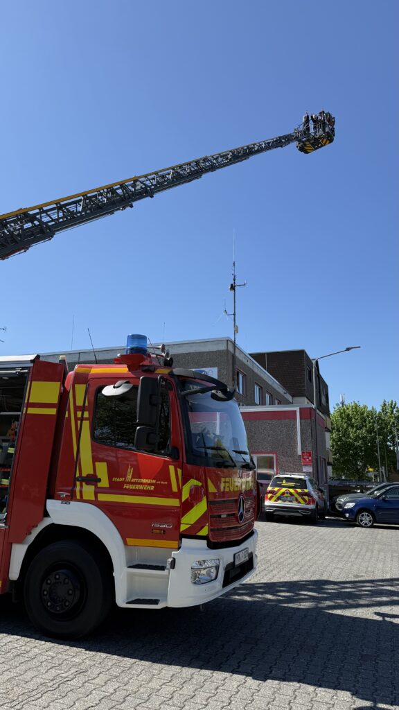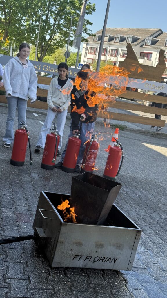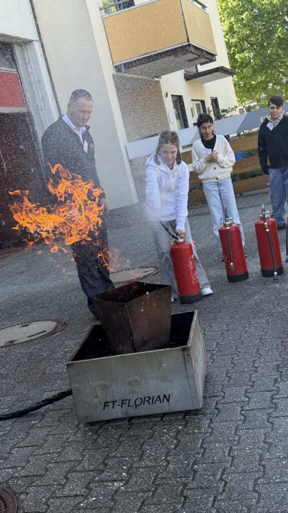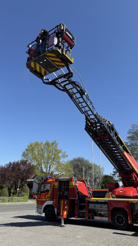 An vier praxisnahen Stationen konnten die Teilnehmenden selbst aktiv werden und typische Aufgaben der Feuerwehr kennenlernen. An der Drehleiter erhielten sie Einblicke in eines der markantesten Einsatzmittel und konnten erleben, wie Menschen aus Höhen gerettet werden. Beim Feuerlösch-Training stand der richtige Umgang mit Feuerlöschern im Mittelpunkt – inklusive eigener Löschversuche.