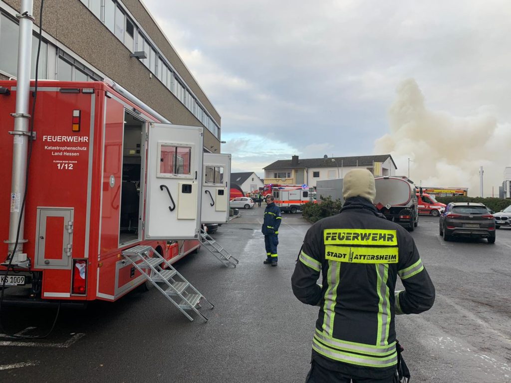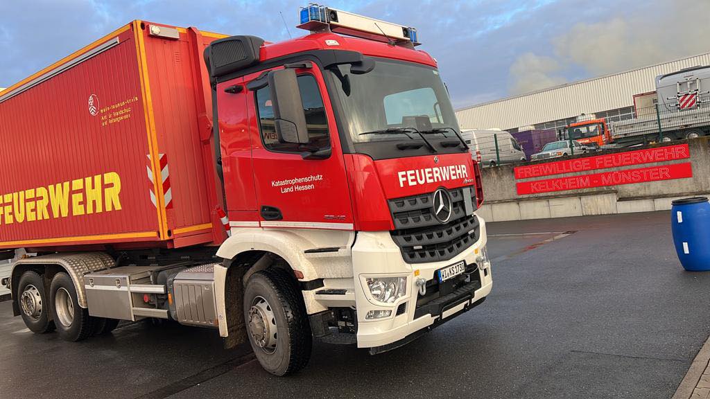 In Hattersheim ist der Abrollcontainer Aufenthalt stationiert, der vom Wechselladerfahrzeug (WLF) der Feuerwehr Hattersheim an die Einsatzstelle gebracht wird.